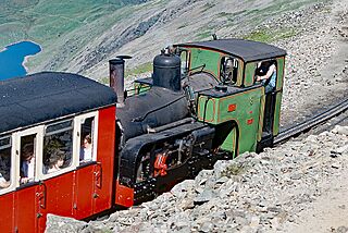 Description: SMR rack locomotive 8 Eryri. Built by SLM in 1923. Scanned from a Kodachrome 35mm slide.
