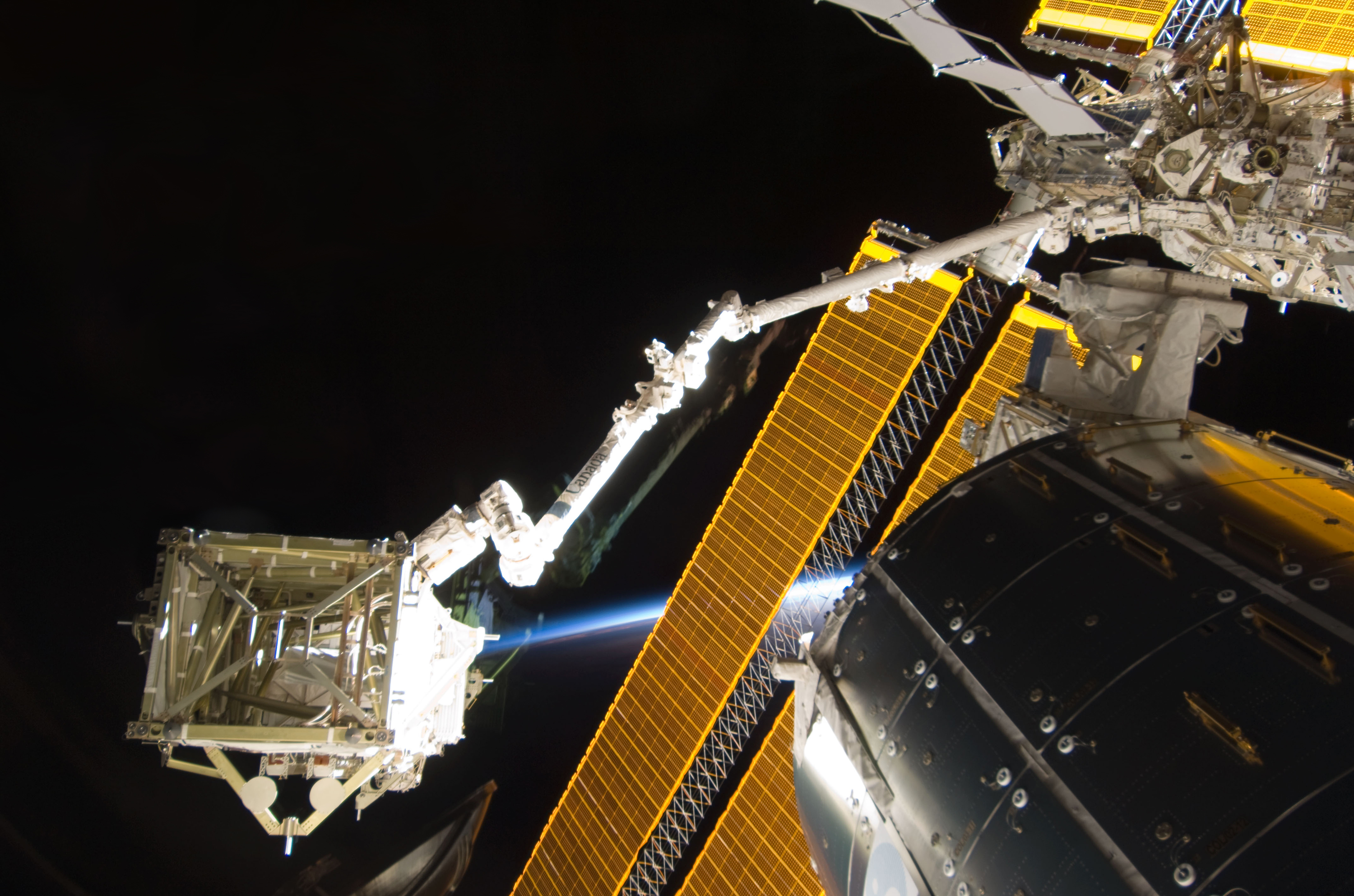 Description: In the grasp of the International Space Station’s robotic Canadarm2, the S6 truss segment was photographed by a STS-119 crewmember while Space Shuttle Discovery was docked with the station. The S6 truss segment was moved from Discovery’s cargo bay by the station’s Canadarm2, handed off to the shuttle’s remote manipulator system (RMS), and then handed back to the station’s robotic arm where it will remain in an overnight parked position. Also visible in the image are the Columbus laboratory, starboard truss and solar array panels.