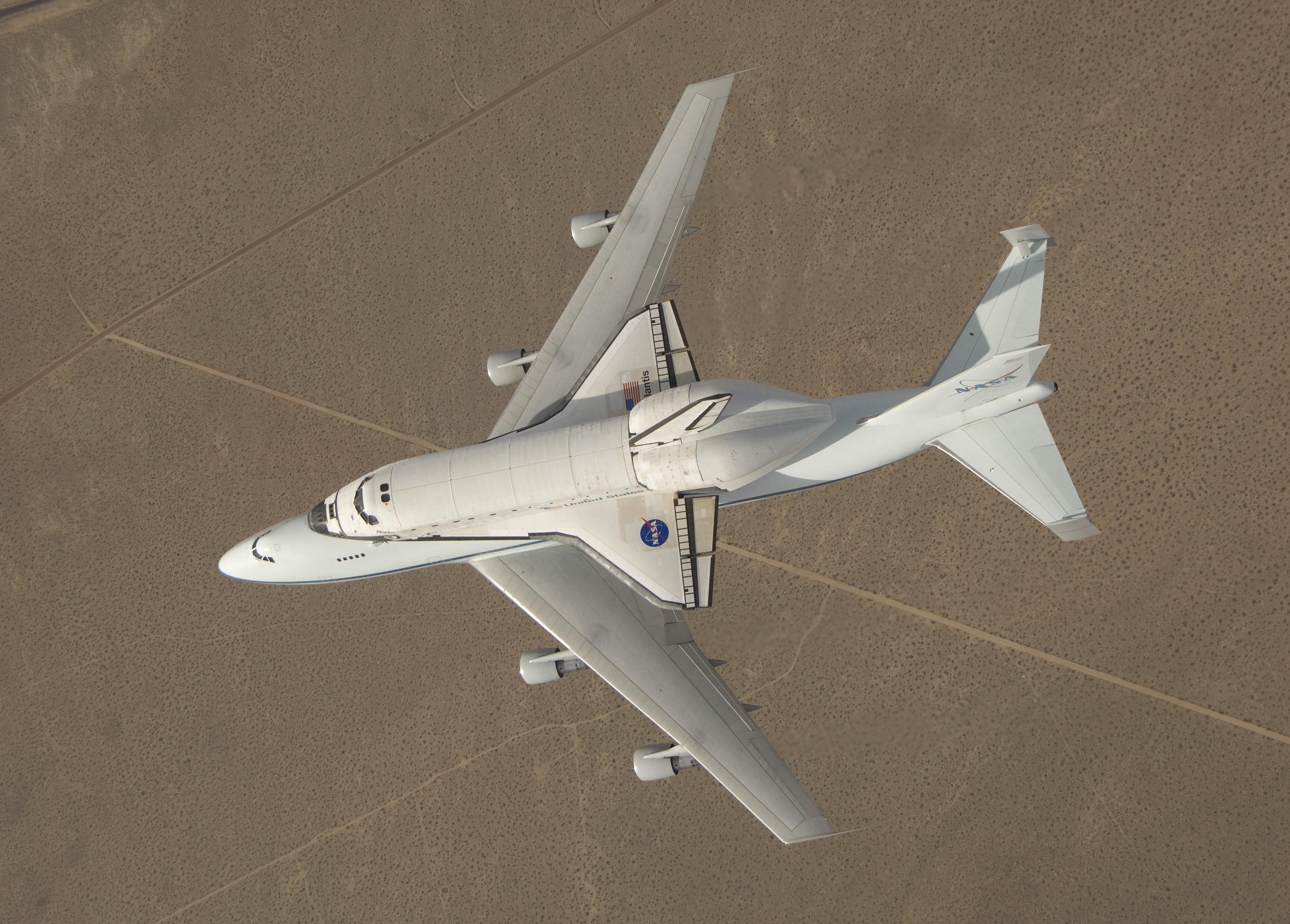 Description: NASA Dryden photographer Jim Ross captured this overhead view of Space Shuttle Atlantis atop NASA's modified 747 carrier aircraft over California's high desert from an F/A-18 mission support aircraft after departing Edwards Air Force Base on a ferry flight back to the Kennedy Space Center in Florida.