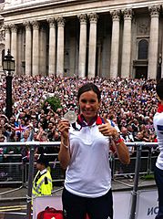 Description: Samantha Murray holding her silver medal at the London 2012 Olympics after winning the Women's Modern Pentathlon