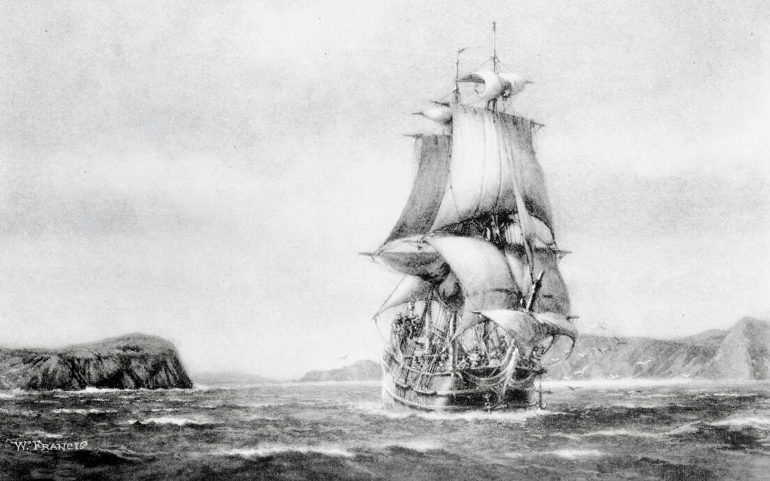 Description: Photograph of a drawing by Walter Francis depicting the ship San Carlos entering the bay of San Francisco on August 5, 1775. The ship was the first ship to enter the bay and is at the center of the picture, its sails catching the wind as it cuts through the rough water of the bay, which is marked by whitecaps. There is a flock of seagulls to the right of the ship, above where the anchor is hanging. There is a land mass jutting out into the water on the left side of the picture and more land in the background behind the ship. Photoprint reads: "Drawn for 'The Beginnings of San Francisco'".