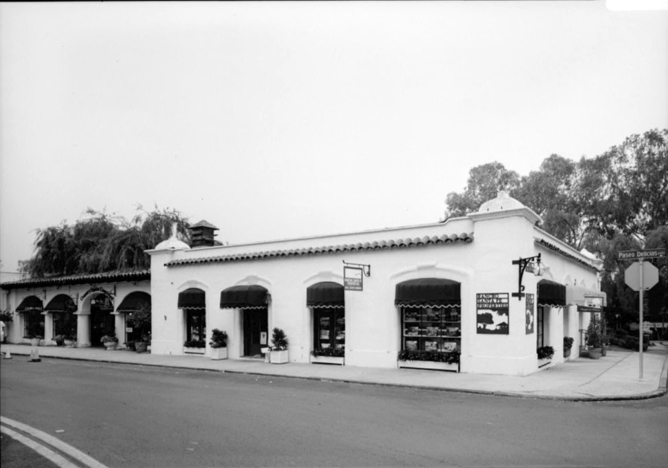 Description: National Register of Historic Places in California Santa Fe Land Improvement Company, Office Building, 16915 Avenida de Acacias, Rancho Santa Fe, San Diego County, CA. Northwest and southwest sides, administration building to left. Building/structure dates: 1922 initial construction.