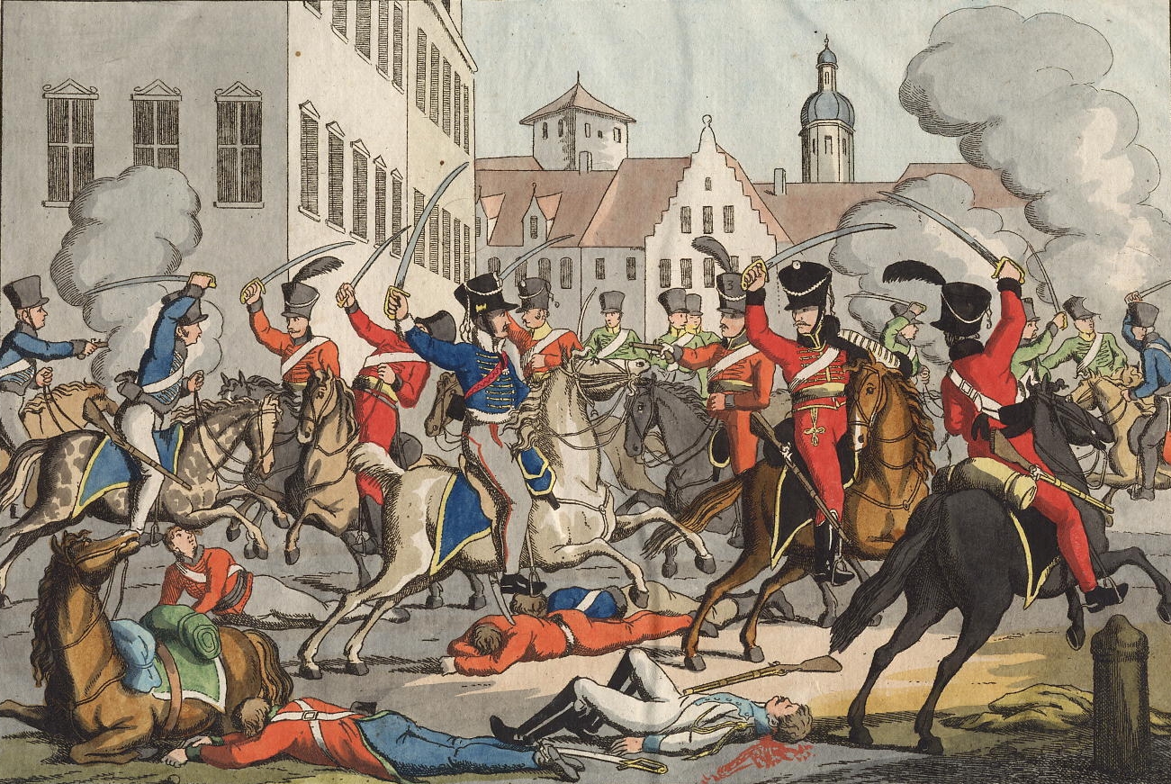 Description: Gefecht in Stralsund zwischen Husaren 1809.