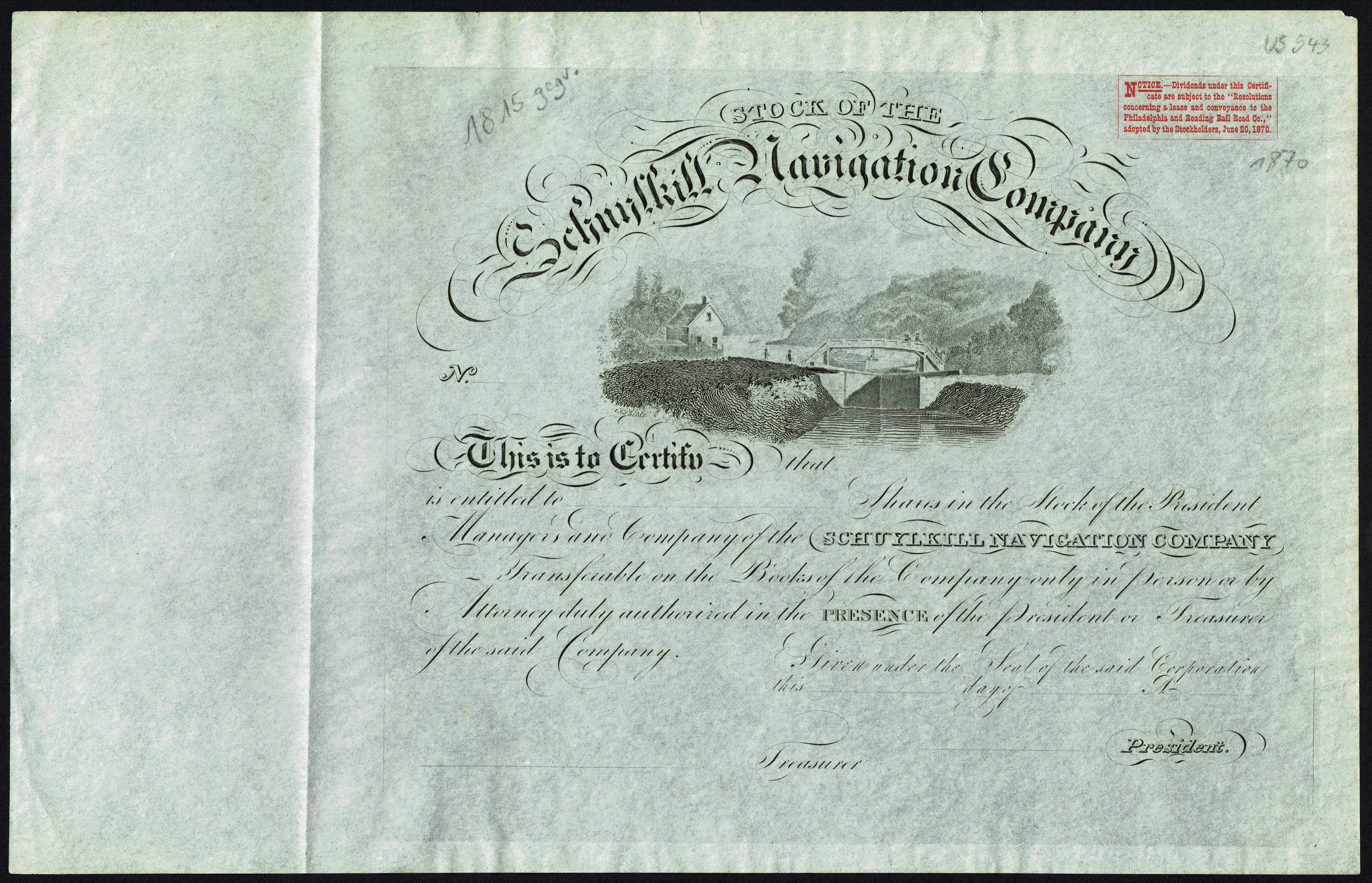 Description: unissued share of the Schuylkill Navigation Company from about 1870