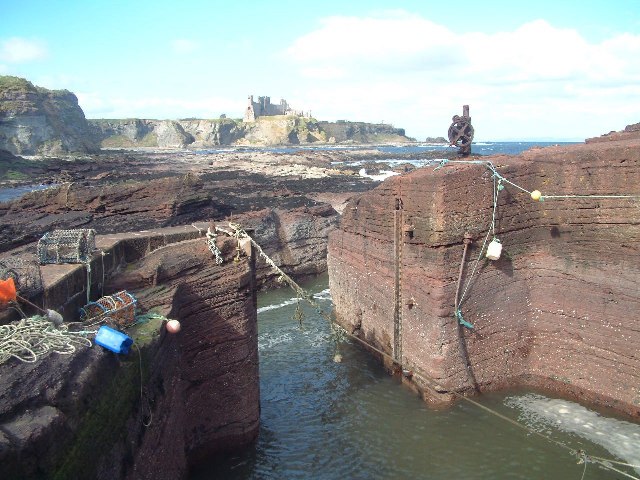 Description: Seacliff Harbour This is the smallest harbour in the British Isles, with an entrance barely two metres wide and accommodating a single fishing boat. The harbour is blasted out of the Gegan Rock. Tantallon Castle is in the background.