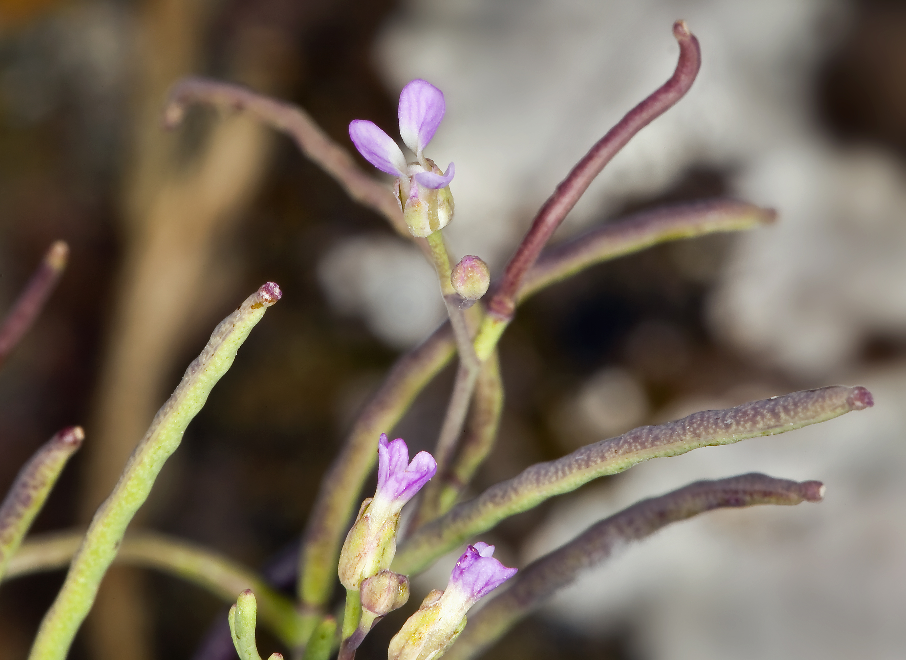 Description: Sibara filifolia (Santa Cruz Island winged rockcress). A closer view of fruits on this is a very rare plant in the mustard family, unique to just two or three of California's Channel Islands. It is closely related to Arabis, and the genus name is in fact Arabis spelled backwards.