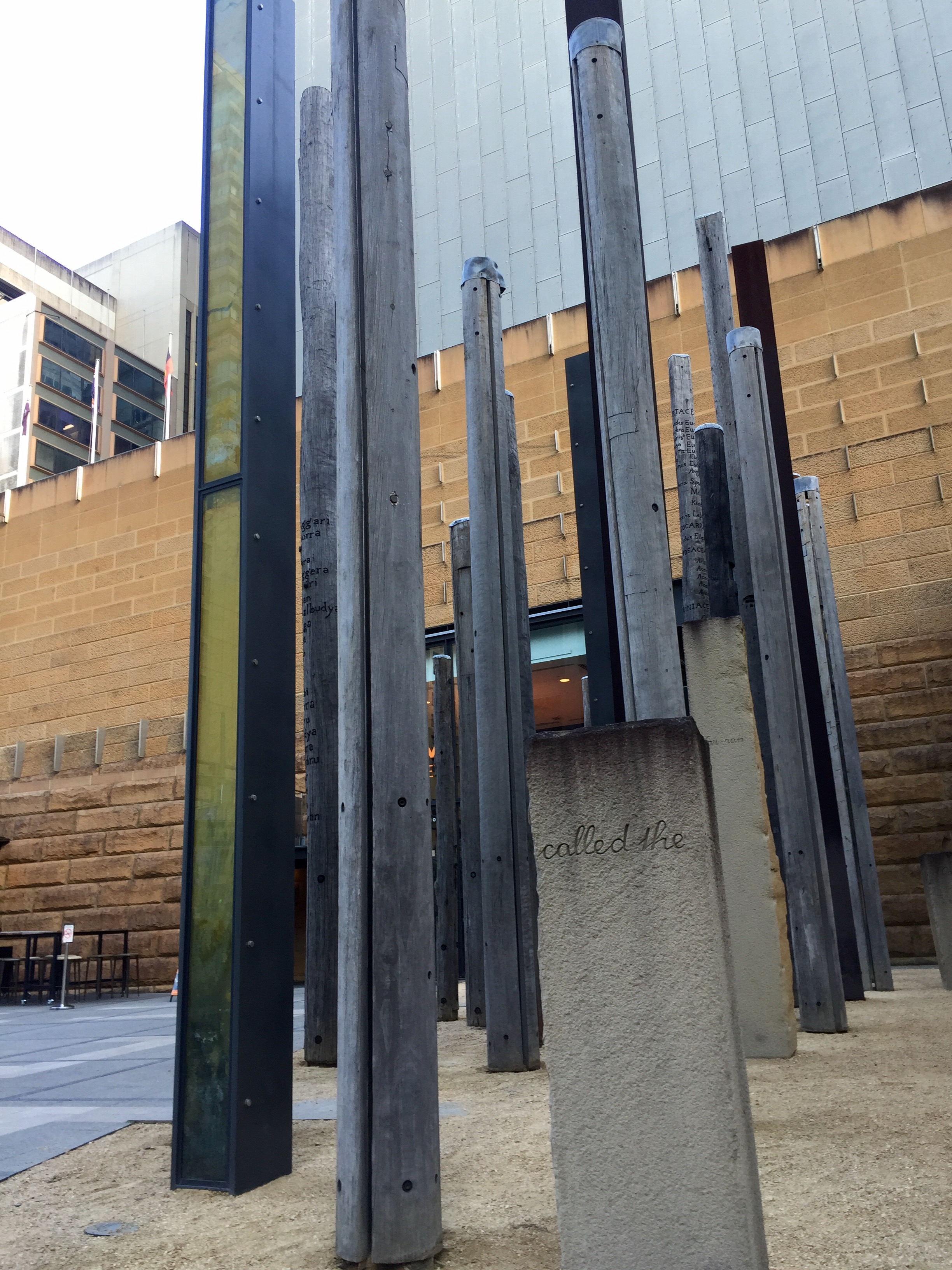 Description: side view of installation work with museum entrance at the background