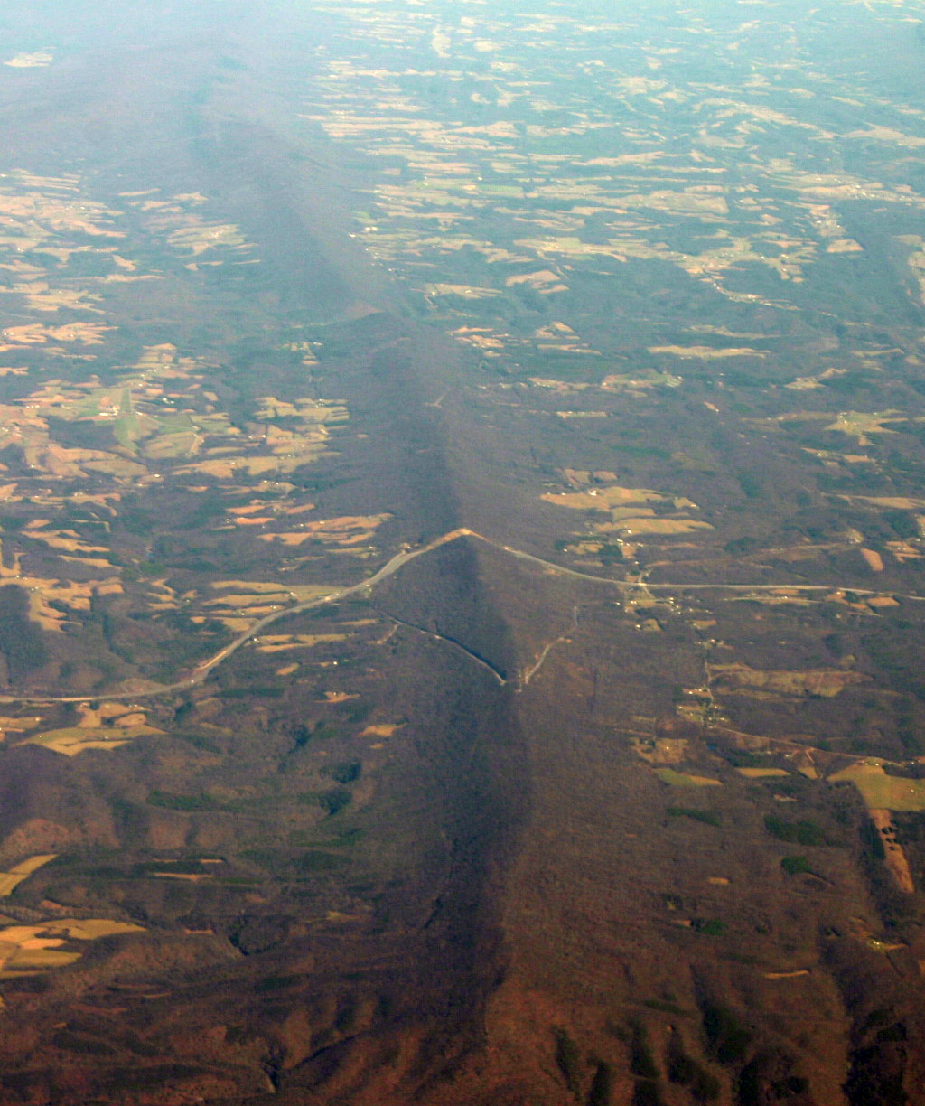 Description: Oblique air photo of Sideling Hill facing north, with the Interstate 68 roadcut near center. Taken February 2006. Image color and contrast enhanced.