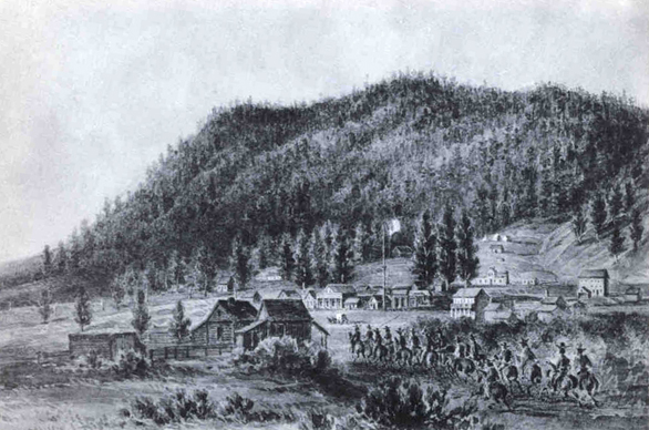 Description: Captain James Hervey Simpson’s expedition arriving at Genoa, a Mormon settlement on the eastern slopes of the Sierra Nevada's near Lake Tahoe.