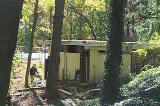 Description: Flat roofed one story pool house adjoining Six Moon Hill pool. Neighborhood volunteer sworking on repairs