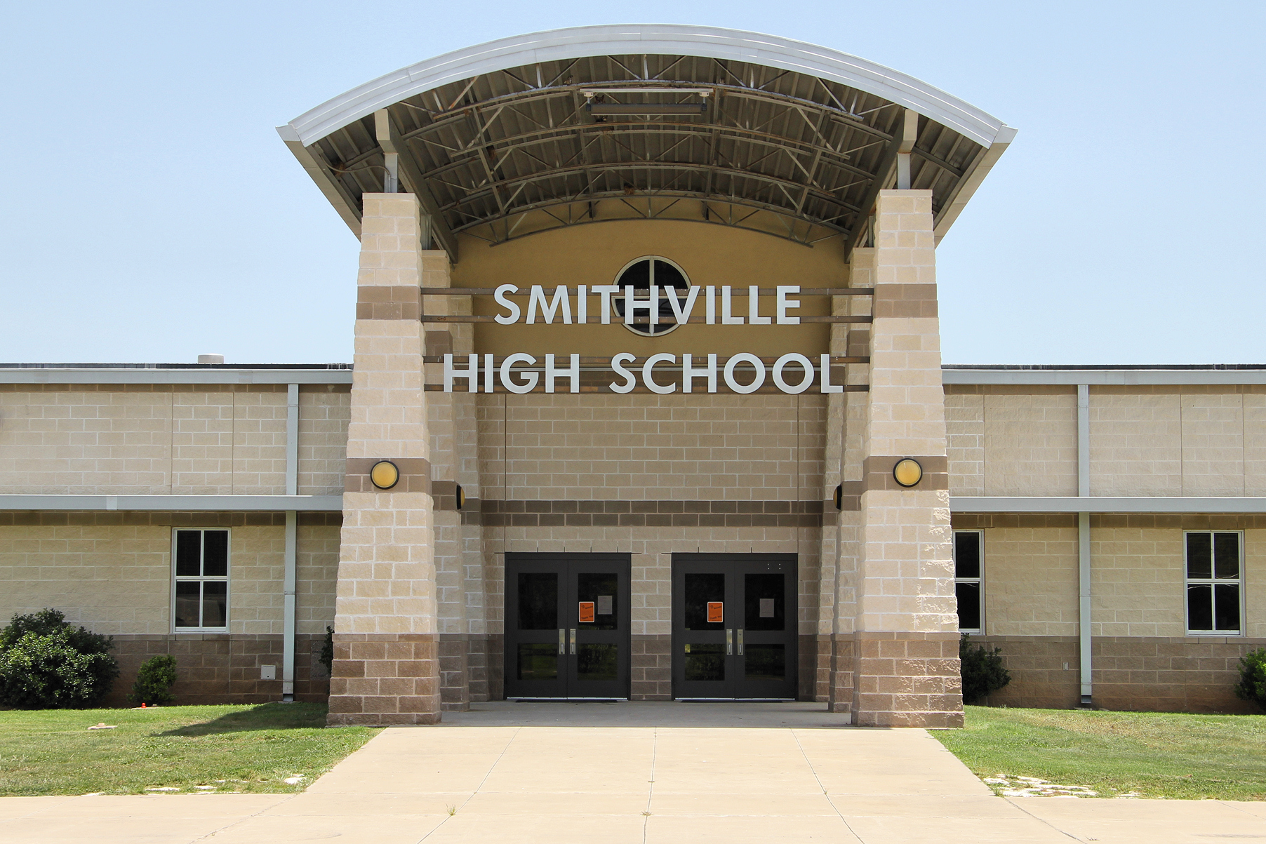 Description: The front entry to Smithville High School in Smithville, Texas, United States.
