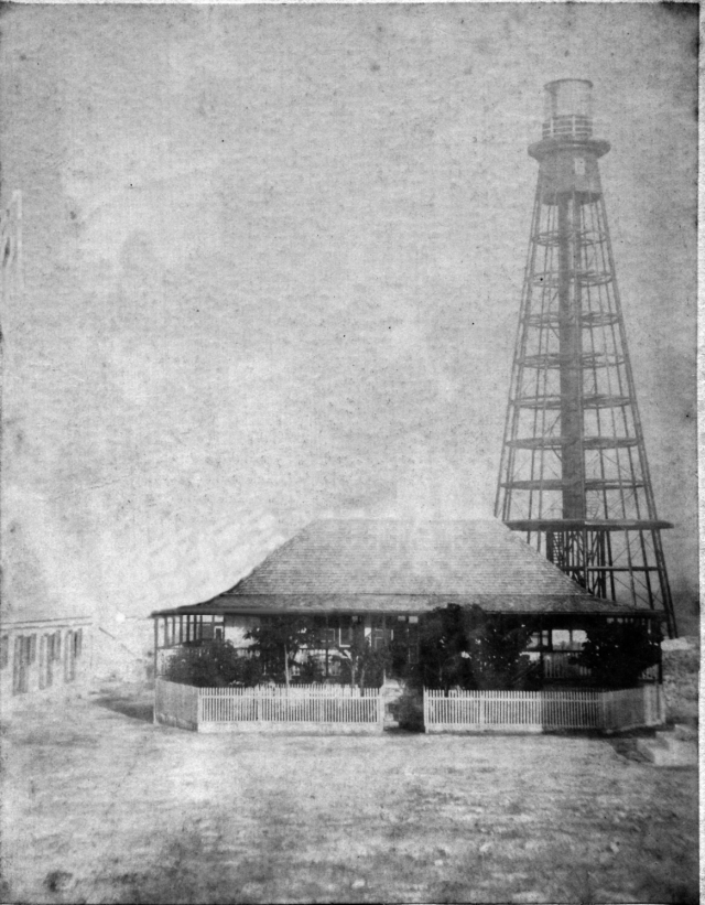 Description: Old lighthouse, Sombrero, and superintendant's house about 1880.