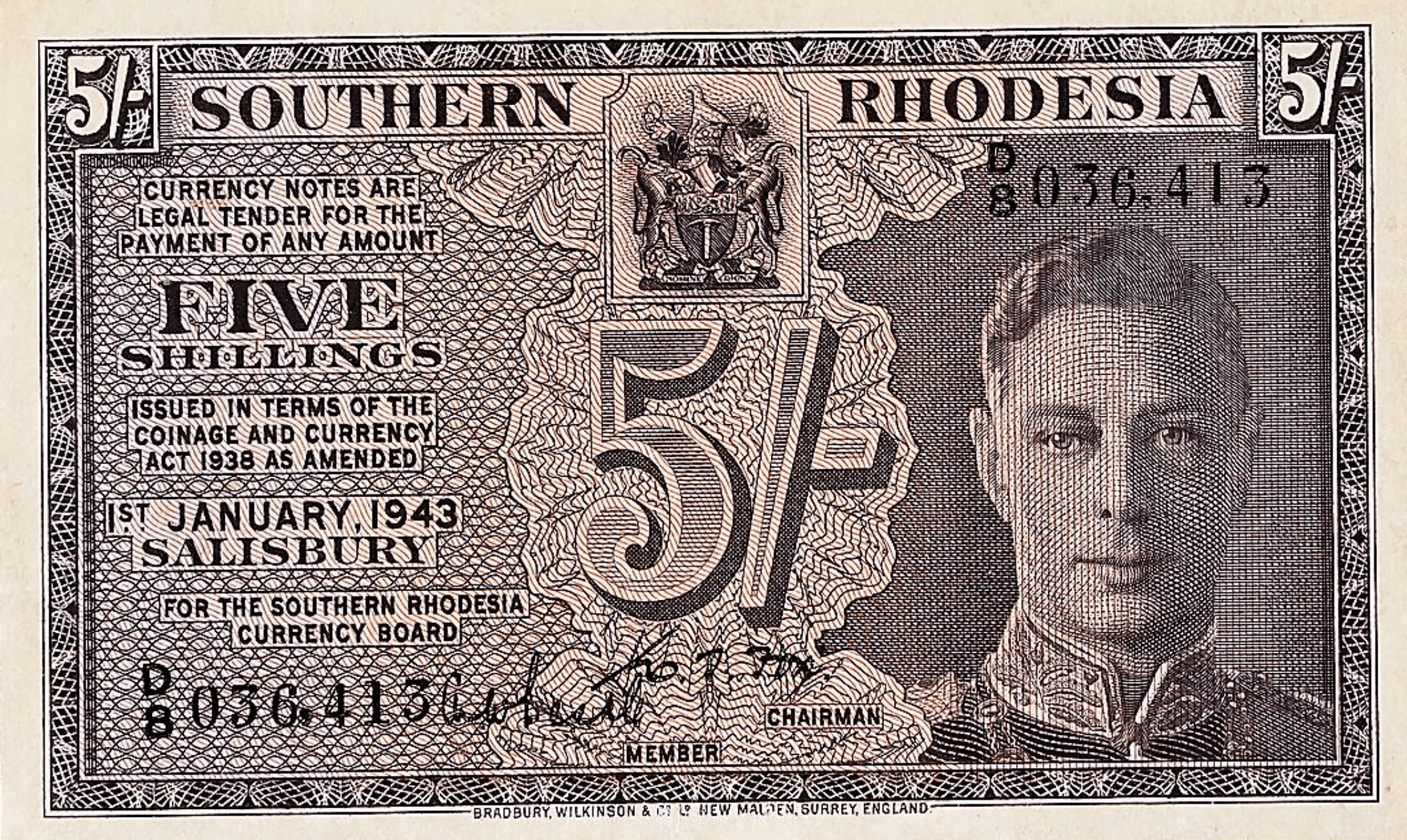 Description: This is an image of the front of the paper Southern Rhodesian 5/- note, printed in 1943.