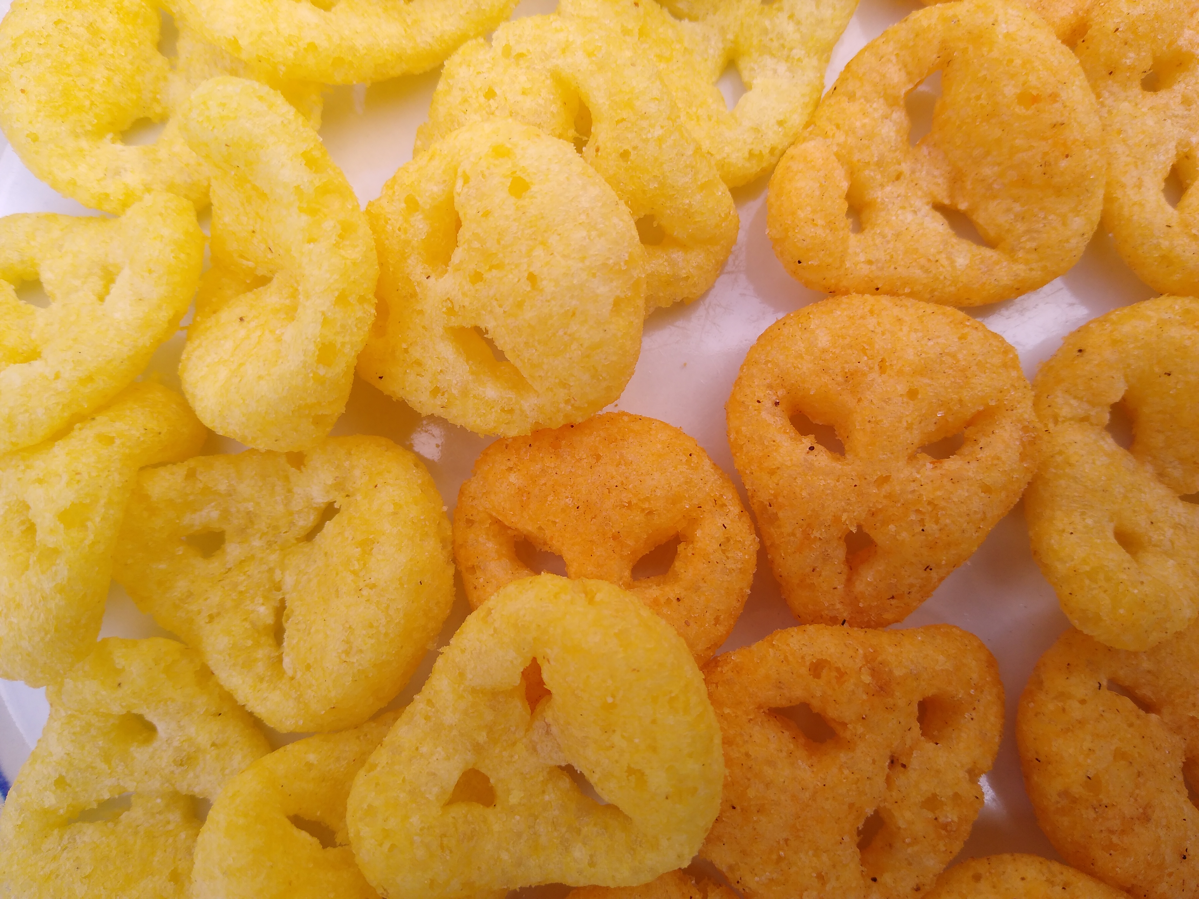 Description: Space Raiders, a snack sold in the UK. Pickled onion flavour (left) and saucy BBQ flavour (right).