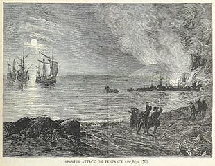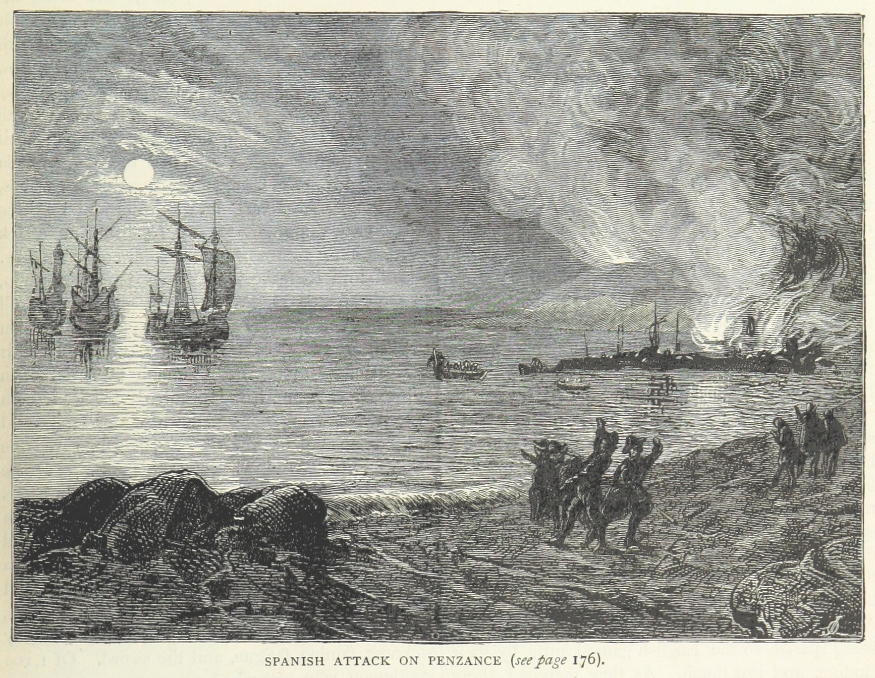 Description: The Spanish attack on Penzance in 1595, part of the Battle of Cornwall.