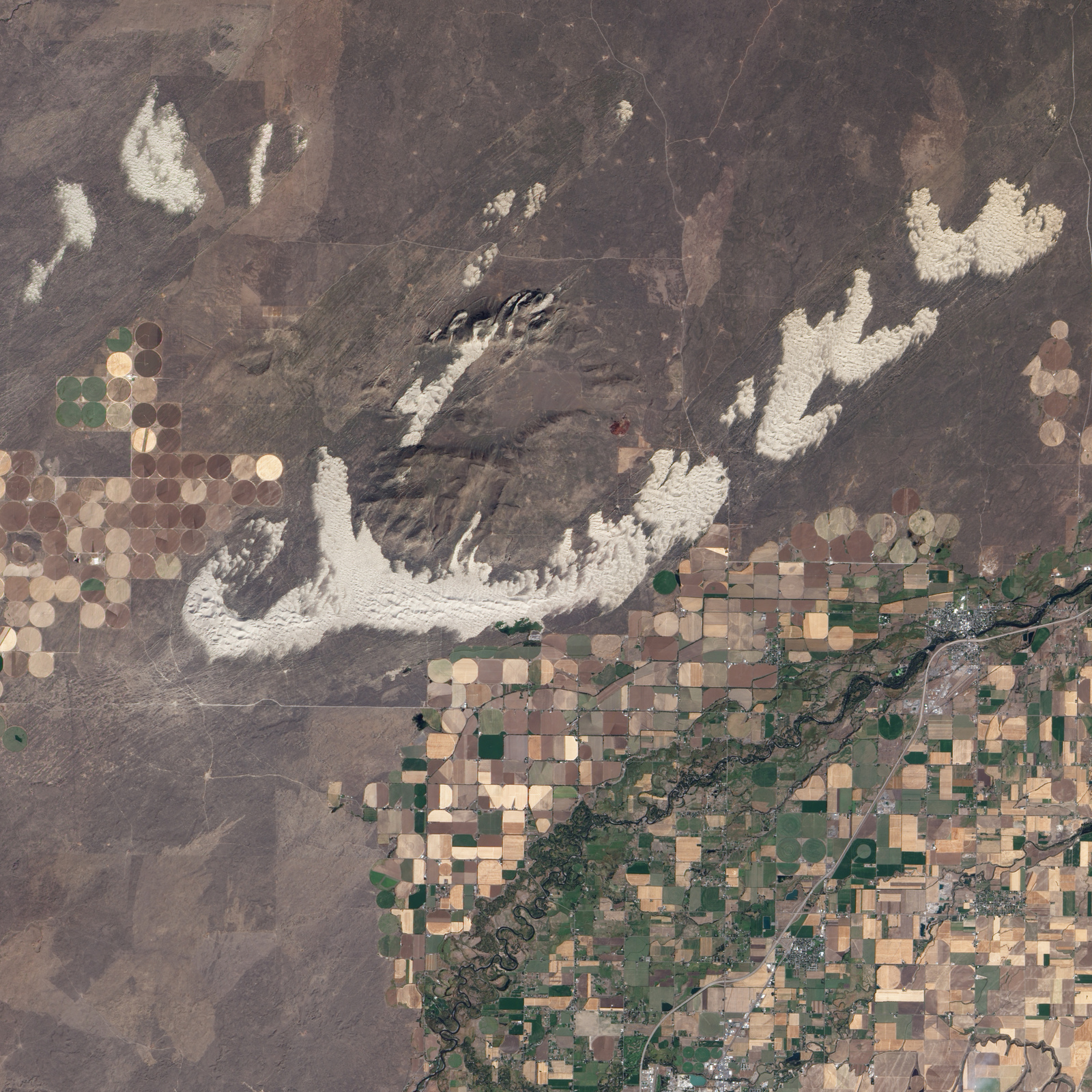 Description: Dunes spill across the Snake River Plain in a wide arc in this detailed, photo-like image. Freshly harvested fields line the southern boundary of the dunes, and to the north is a darker brush-covered lava plain. The dunes formed about 10,000 years ago, at the end of the last ice age when the Earth’s climate shifted. Eastern Idaho’s climate became warmer and drier. Lakes shrank, exposing fine sand. Persistent winds from the south-west blew the sand north-east across the lava plain visible in the lower left corner of the image. Dunes form only when sand encounters a soft surface or obstacle that prevents it from blowing away. The St. Anthony Dunes began to form when the sand reached the weathered mass of the Juniper Buttes, extinct volcanoes. Each individual dune forms a curve, with ends pointing north-east in the direction of the wind. This type of dune is a barchan dune, Arabic for ram’s horn. East of the volcanoes, the sand encountered another obstacle that kept it in place: more dunes. These older dunes, longitudinal dunes, are plant-covered sand dunes that formed in a previous, more arid climate, says Idaho State University geologist Paul Link. The longitudinal dunes formed on top of an old flood plain, from a branch of the Snake River, probably from sand blown from the river’s bank. The longitudinal dunes are long, dark stripes under the newer brilliant white dunes—layers of climate history visible at a glance.