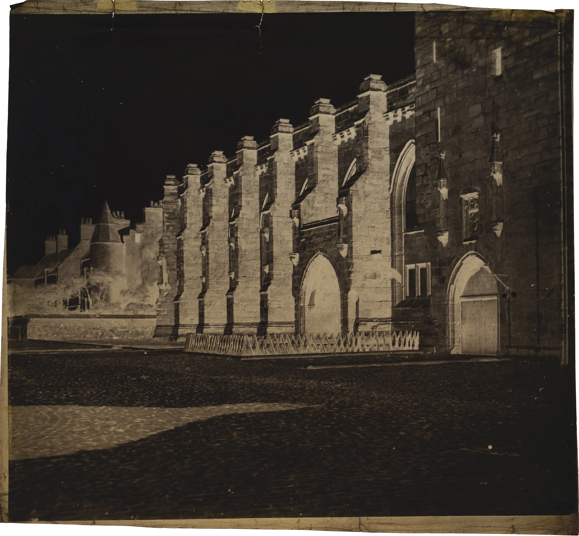 Description: This waxed-paper negative shows the south facade of St. Salvator's Chapel as seen from North Street. The view shows the buttresses prior to the addition of finials c. 1860.