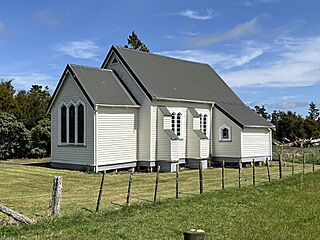Description: St Luke's Anglican Church, 1 km north of Whataroa, New Zealand, was dedicated by Bishop Julius on 10 July 1919, during his annual visit to the West Coast. The church includes a three-light memorial stained-glass window behind the altar, donated by the Burrough family in memory of Joseph Burrough who died while serving in France during World War I.