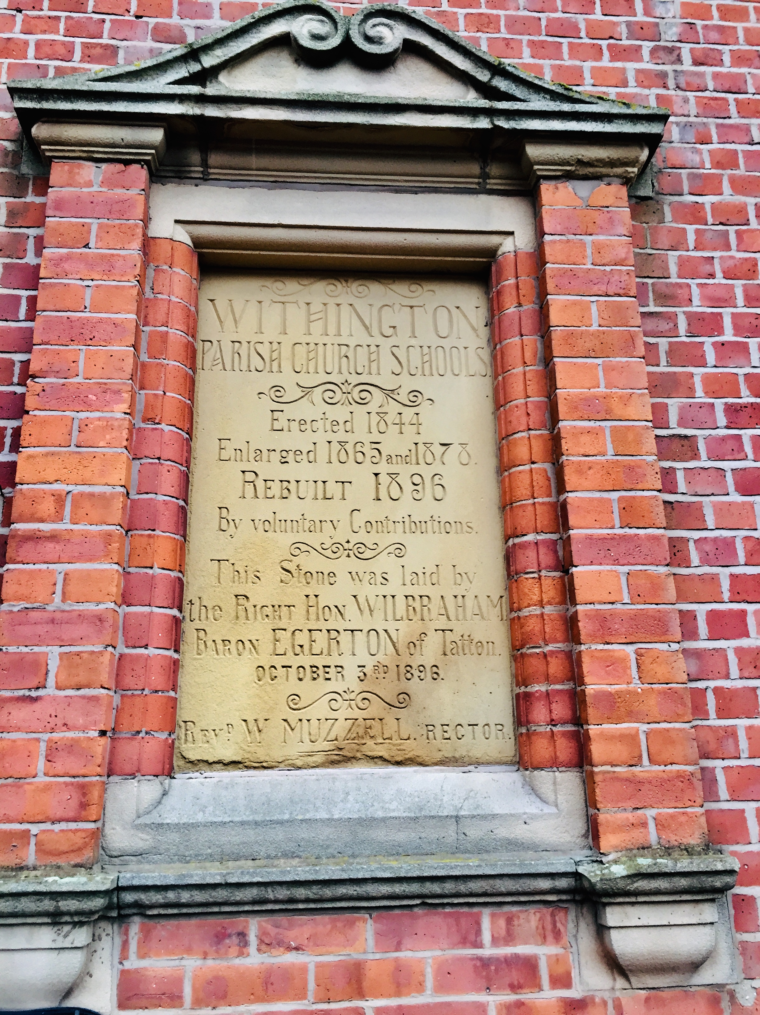 Description: Foundation stone outside the old St Paul’s Primary School in Withington, Manchester (1896 building). Inscription reads: Withington Parish Church Schools Erected 1844 Enlarged 1865 and 1878 Rebuilt 1896 by voluntary contributions This stone was laid by the Right Hon. WILBRAHAM Baron EGERTON of Tatton October 3rd 1896 Revd W MUZZEL Rector