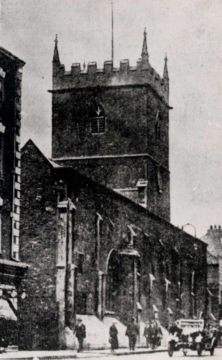 Description: Grainy black and white photograph of St Peter's parish church, Bristol, England, taken about 1925. The view is from the northeast showing the nave of the church with the tower behind. On the extreme left and extreme right of the image are buildings of the Castle district, which were heavily bombed in the Bristol Blitz, leaving the area now called Castle Park. In the foreground of the image the street scene includes six people and a motor car.