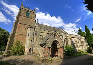 Description: St Peter's parish church, Elford, Staffordshire, seen from the southwest. The tower was built in 1598. The rest of the church was rebuilt in 1848–49 and 1869–70.