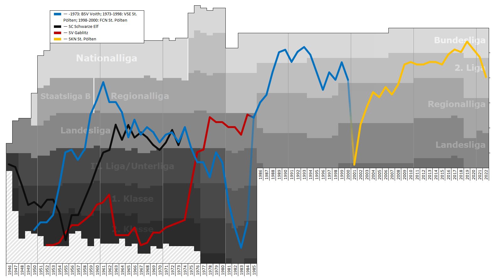 Description: Chart of end-season table positions of St Pölten and its predecessors in the Austrian football league system. Data source: RSSSF, soccerway.com, regiowiki.at, noefv.at, wikipedia