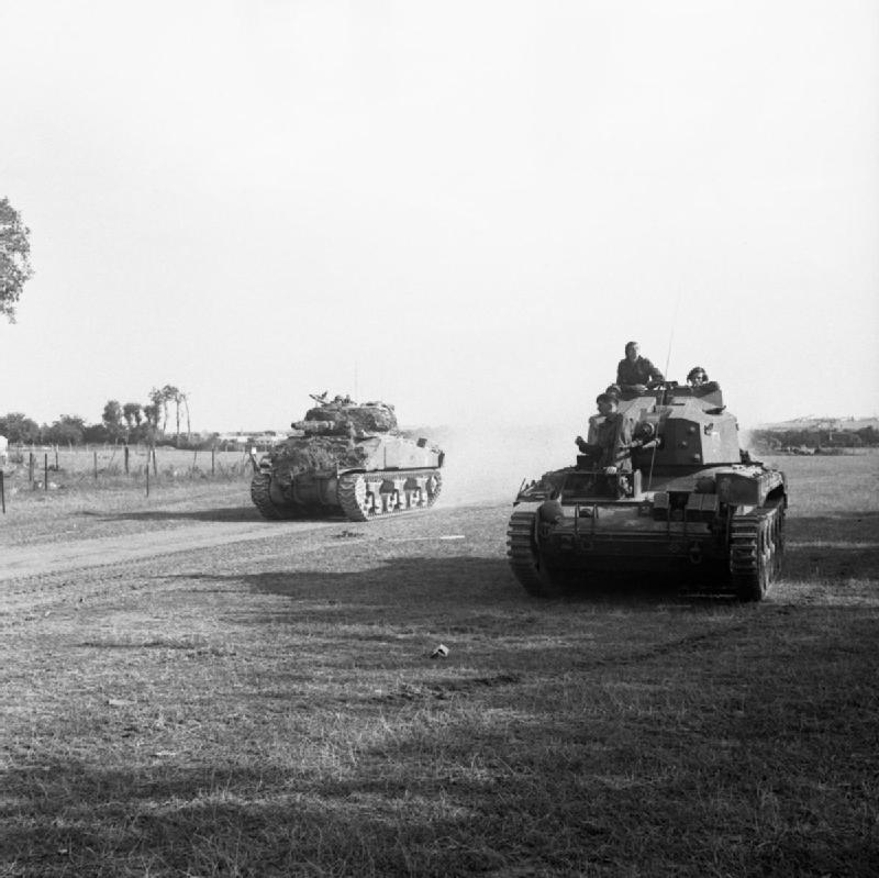 Description: A Sherman tank and an Crusader AA Mk III tank of the Staffordshire Yeomanry in France during Operation Goodwood, July 1944