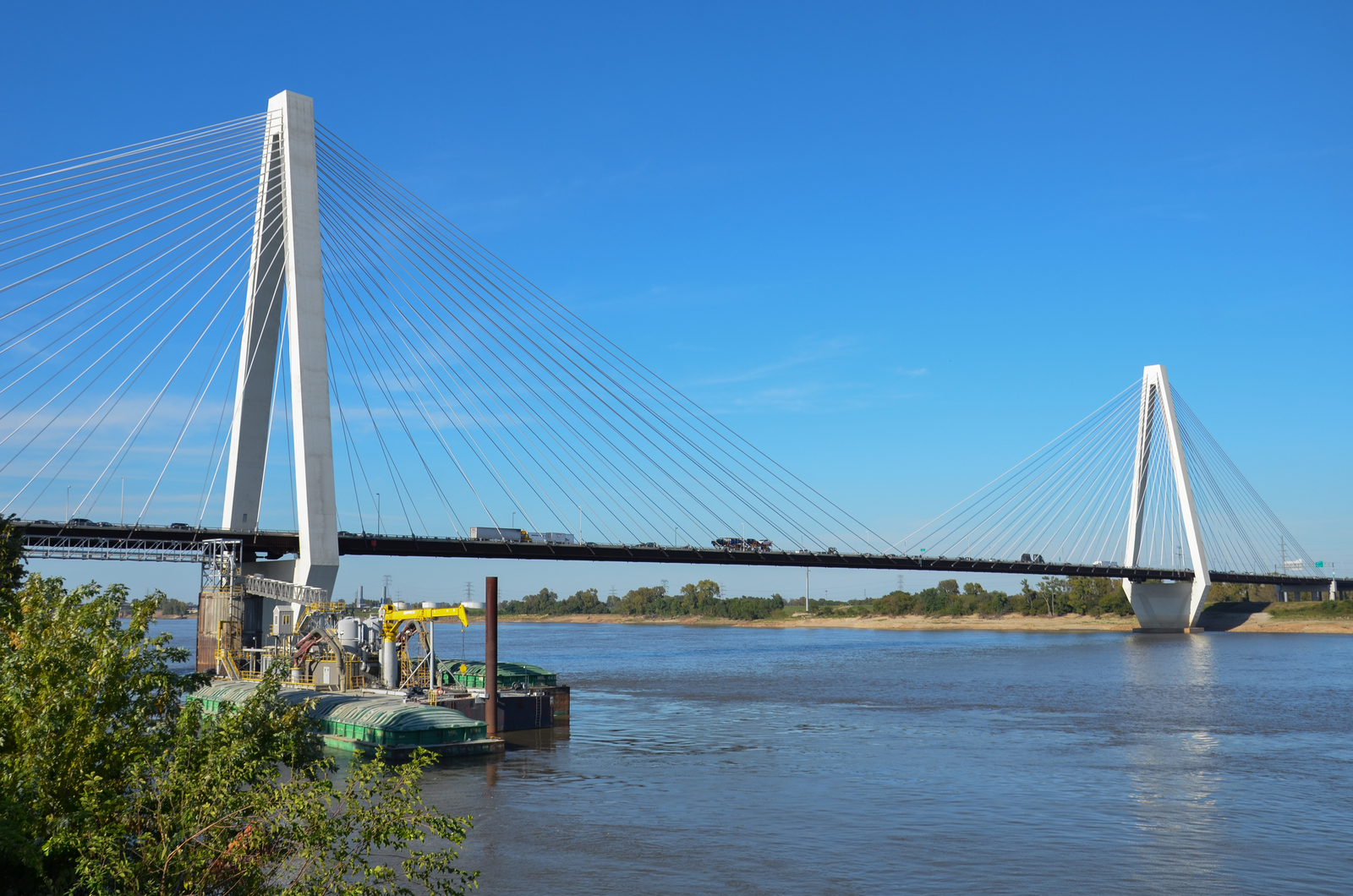 Description: Stan Musial Veterans Memorial Bridge as seen from the western bank of the Mississippi River.