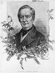 Description: Etching of Captain Charles Sturt. Australian explorer. Sturt was born in British India and sent to England at the age of 5 to be educated. He joined the British Army in 1813, seeing action with the Duke of Wellington in Spain and at Waterloo, rising to the rank of Captain in the 39th (Dorsetshire) Regiment of Foot. With his regiment he escorted convicts to New South Wales and arrived in 1827. He explored the Australian interiors, particularly the rivers flowing westward in New South Wales. In 1829. Sturt then proceeded down the Murray, until he reached the river's confluence with the Darling. Sturt had now proved that all the western-flowing rivers eventually flowed into the Murray. (Information taken from Charles Napier Sturt, retrieved 2 February 2007 from http://en.wikipedia.org/wiki/Image:CharlesSturt.jpg).