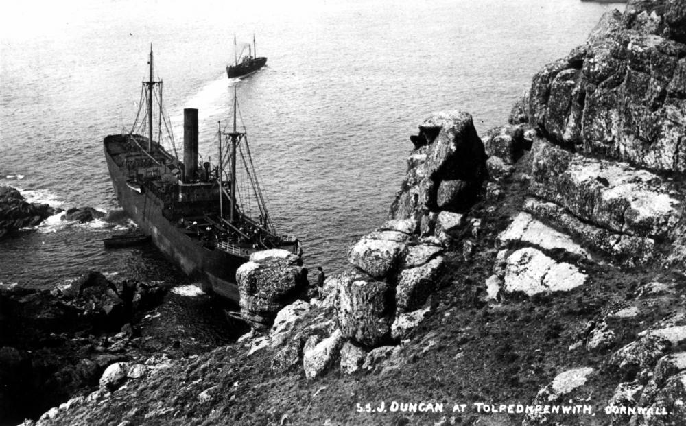 Description: Cargo steamship J Duncan aground on Tol-Pedn-Penwith, Cornwall, in 1913. Built 1905. Owned by J.T. Duncan & Co., Cardiff. (From description supplied with photograph.)