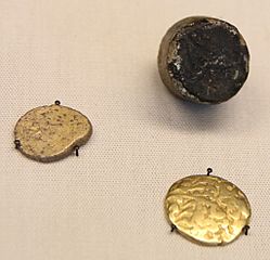 Description: From top to bottom a die for striking a Gallo-Belgic A Stater a blank of the type that would be stuck and a Gallo-Belgic A Stater