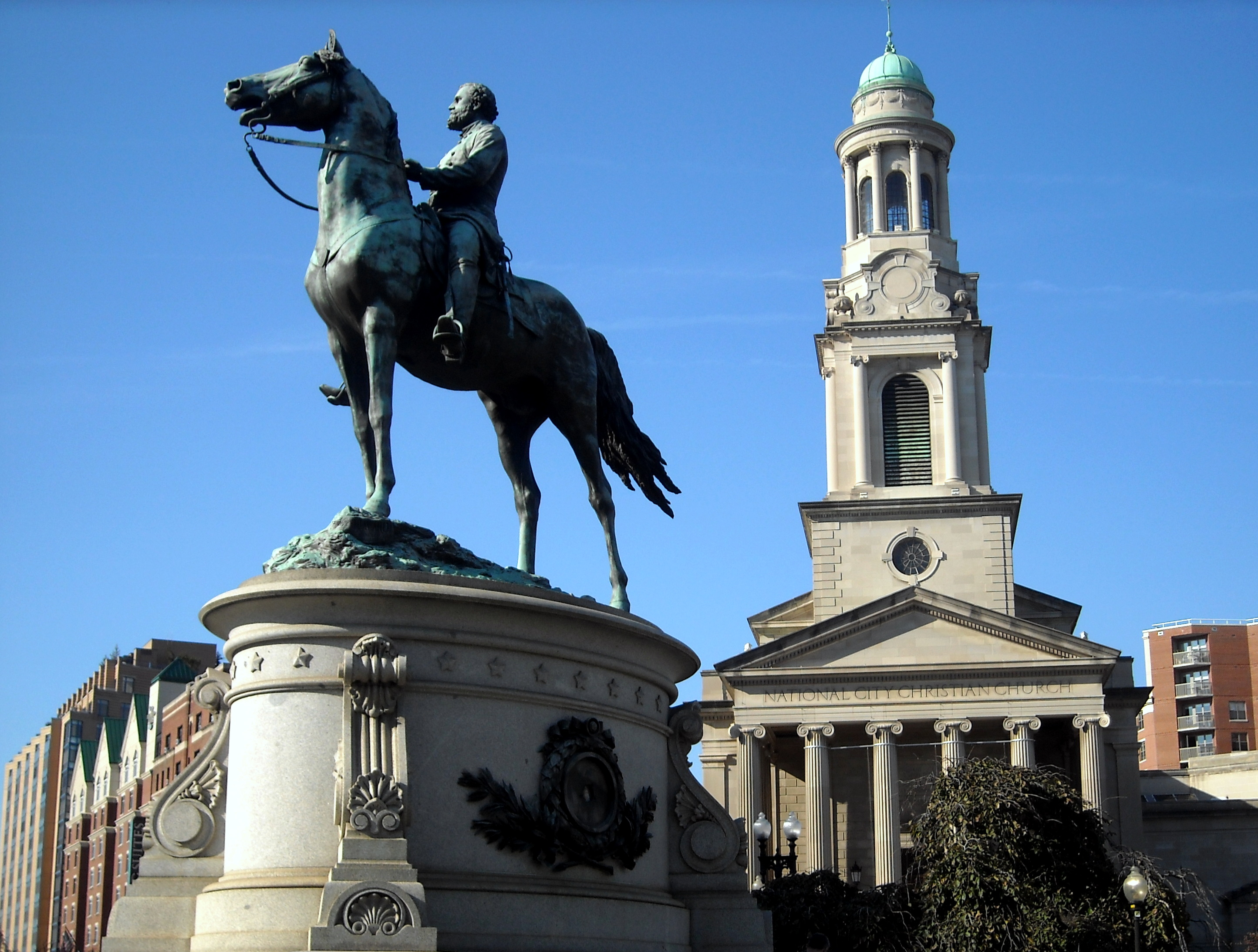 Description: The statue of General George Henry Thomas, a prominent commander during the American Civil War, and the National City Christian Church, the "national cathedral" for the Christian Church (Disciples of Christ) denomination, located on Thomas Circle, in the Logan Circle neighborhood of Washington, D.C. The statue and church are contributing properties to the Fourteenth Street Historic District. The bronze equestrian statue of George Henry Thomas was sculpted by John Quincy Adams Ward, and dedicated on November 19, 1879. The statue is one of seventeen Civil War monuments in Washington, D.C., that were collectively listed on the National Register of Historic Places on September 20, 1978. The statuary was also designated a D.C. Historic Landmark on March 3, 1979. Built in 1930, the National City Christian Church was designed in the neoclassical style by noted architect John Russell Pope. The church was designated a D.C. Historic Landmark on November 8, 1964.