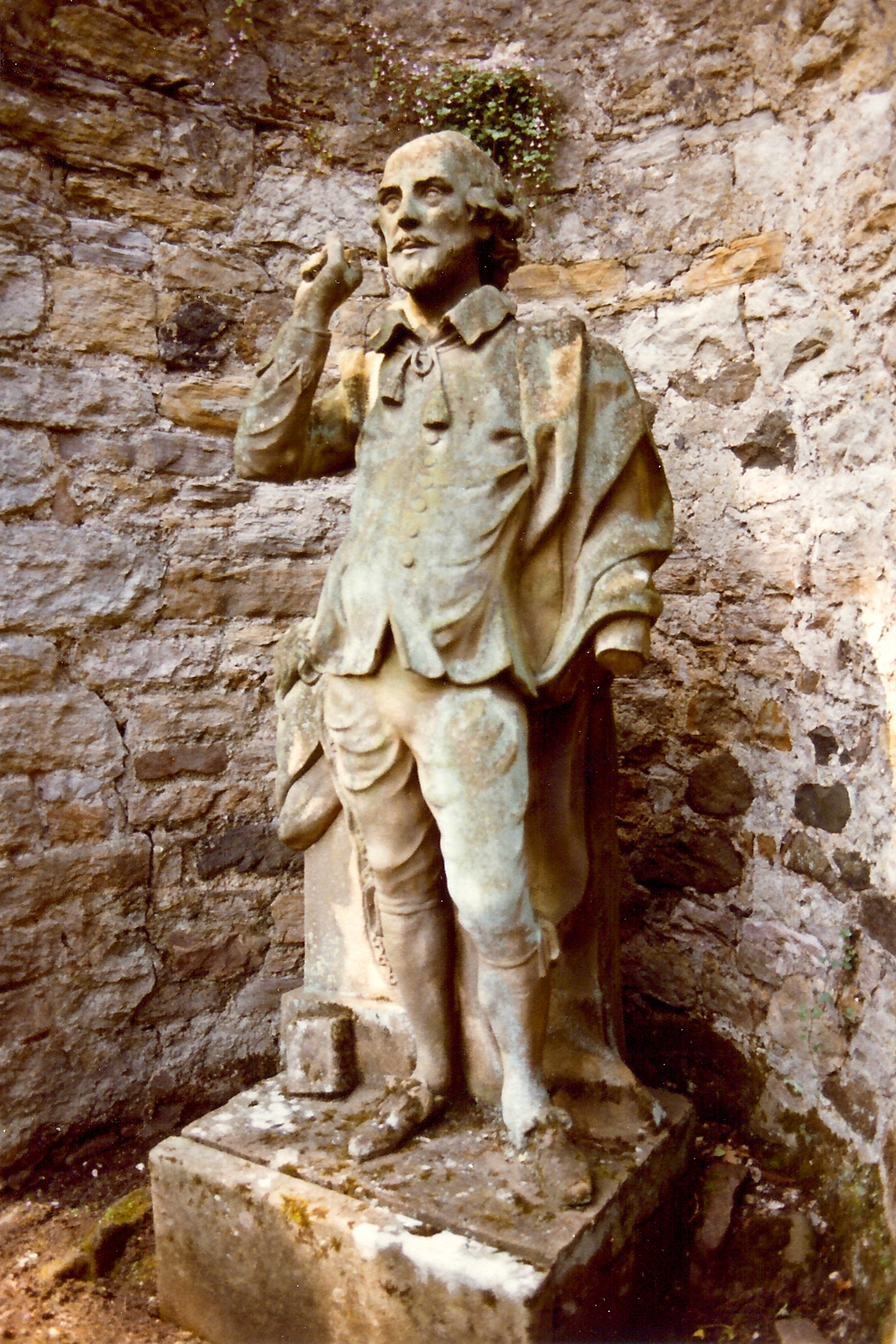 Description: Coade stone statue of William Shakespeare which advocate and writer Lord Henry Cockburn installed in the garden at Bonaly Tower, Edinburgh. It is in a curved recess in the boundary wall at west end of garden. It came from the Theatre Royal at Shakespeare Square at the east end of Princes Street after it was demolished in 1860. It was originally acquired by John Jackson in the 1780s, along with accompanying figures of tragedy and comedy, for the theatre which had its last performance on May 25th. 1859. Photograph taken in the summer of 1981.