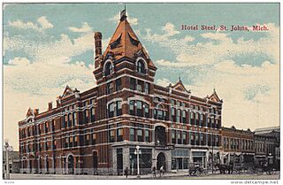 Description: lithograph postcard of the Steel Hotel, St. Johns, Michigan
