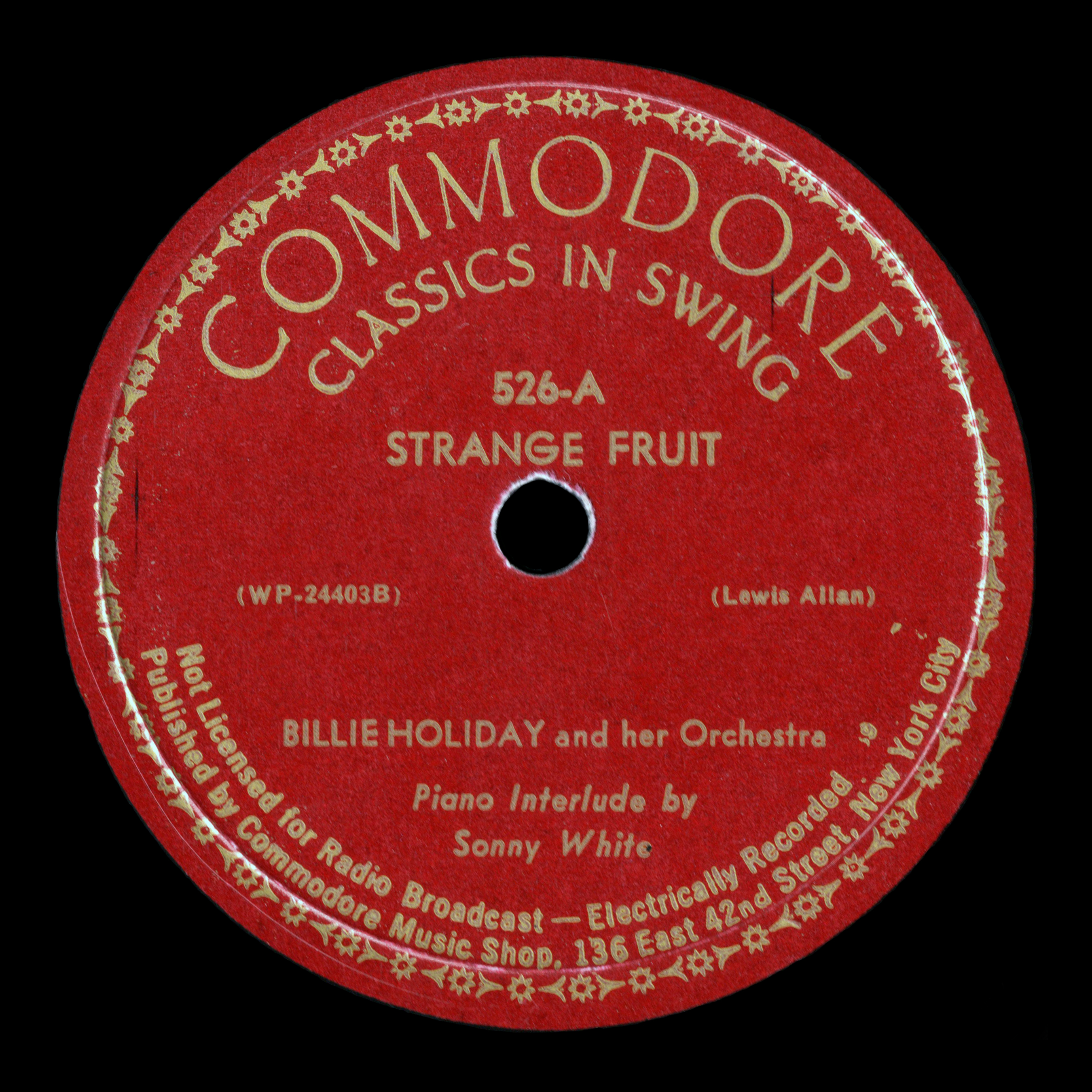 Description: Commodore Records 78 label for "Strange Fruit" by Billie Holiday and Her Orchestra (526A), published by Commodore Music Shop, 136 East 42nd Street, New York City