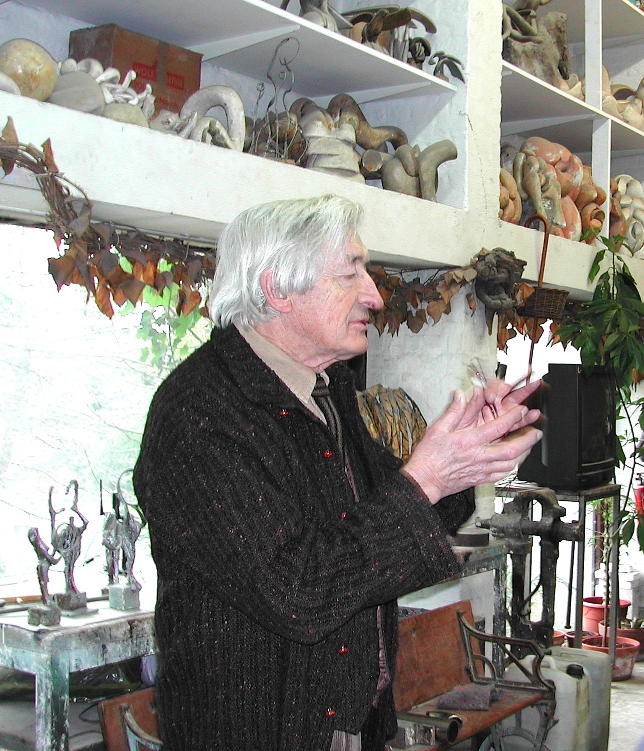 Description: Belgian sculptor Olivier Strebelle talks with a group of American writers in his home/studio outside of Brussels in January 2009.