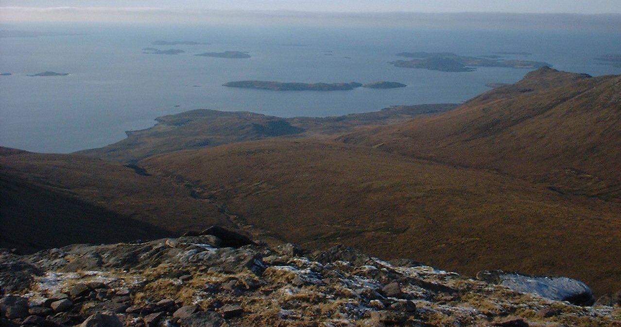 Description: The Summer Isles and Loch Broom taken from Ben Mor Coigach by J. Miall, Jan 2006. The closest, wide island is Horse Island.