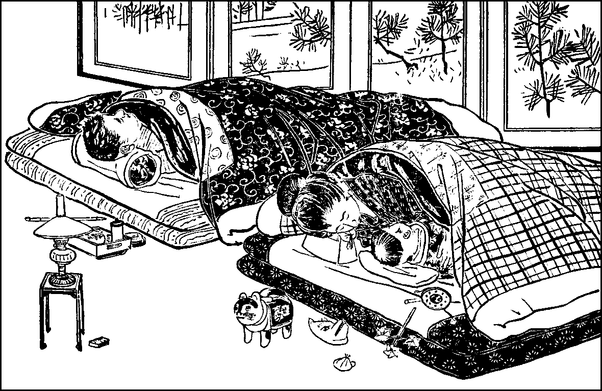 Description: Illustration from page 137 of THE FAMILY IN BED.. Image reference: "51" Caption: "THE FAMILY IN BED. Quote: "In Japanese houses there are, as has been already stated, no rooms exclusively set apart for sleeping. The beds can be laid anywhere on the mats. The bed consists of one or two thickly-wadded mattresses of cotton or silk, usually three feet wide by about six feet long, that is, nearly the size of a mat. These are laid on the mats and over them a large, thickly-wadded cover of the shape of a winter kimono with open sleeves and a quilt, also heavily wadded, of about the same length as the bed but wider. They are both of silk or cotton, figured or striped, with linings of a dark-blue colour. They both have a black velvet band where the sleeper’s face touches them. The two are used in winter; but in spring and autumn only one, usually the kimono-like cover, is thrown over the sleeper. In midsummer, even that is too hot, and is replaced by an ordinary lined kimono or a thinly-wadded quilt. The pillow for men is a long round bolster filled with bran; but women, whose coiffure would be deranged by such a pillow, lay their heads on a small bran bolster, two inches or so in diameter, which is wrapped in paper and tied on the top of a wooden support. It is very uncomfortable at first, though most women are used to it. As the bolster soon gets hard, the skin about the ear often becomes red and rough if one sleeps all night on the same side. Though the beds may be spread anywhere, their places are always fixed for the members of the family. The master and mistress sleep in the parlour or some other large room with the youngest children, the mother with the baby in her bed and the father sometimes with the next youngest in his. The rest of the children sleep either in the same room or in another and with some other member of the family, unless they are quite grown up. The sitting-room is usually left unoccupied. The servants sleep in a room next to the kitchen and the house-boy in the porch. It is important to group the sleepers as much as possible; for in summer when mosquitoes are out, nets are hung over the beds by strings attached to the four corners of the room, and to economise these nets the beds are brought together wherever practicable.""