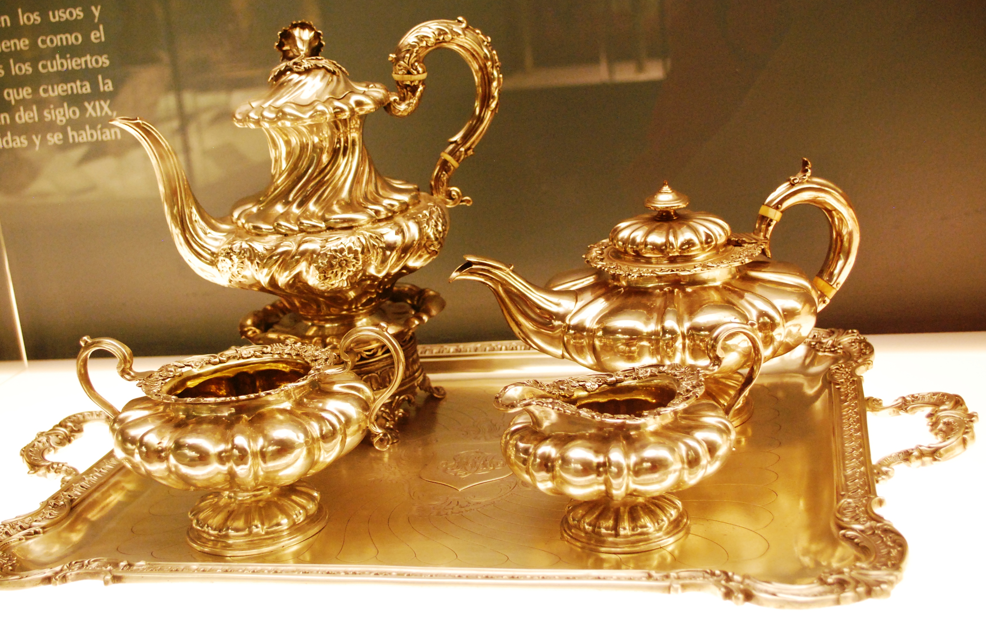 Description: silver and gold tea pots at the Franz Mayer Museum in Mexico City
