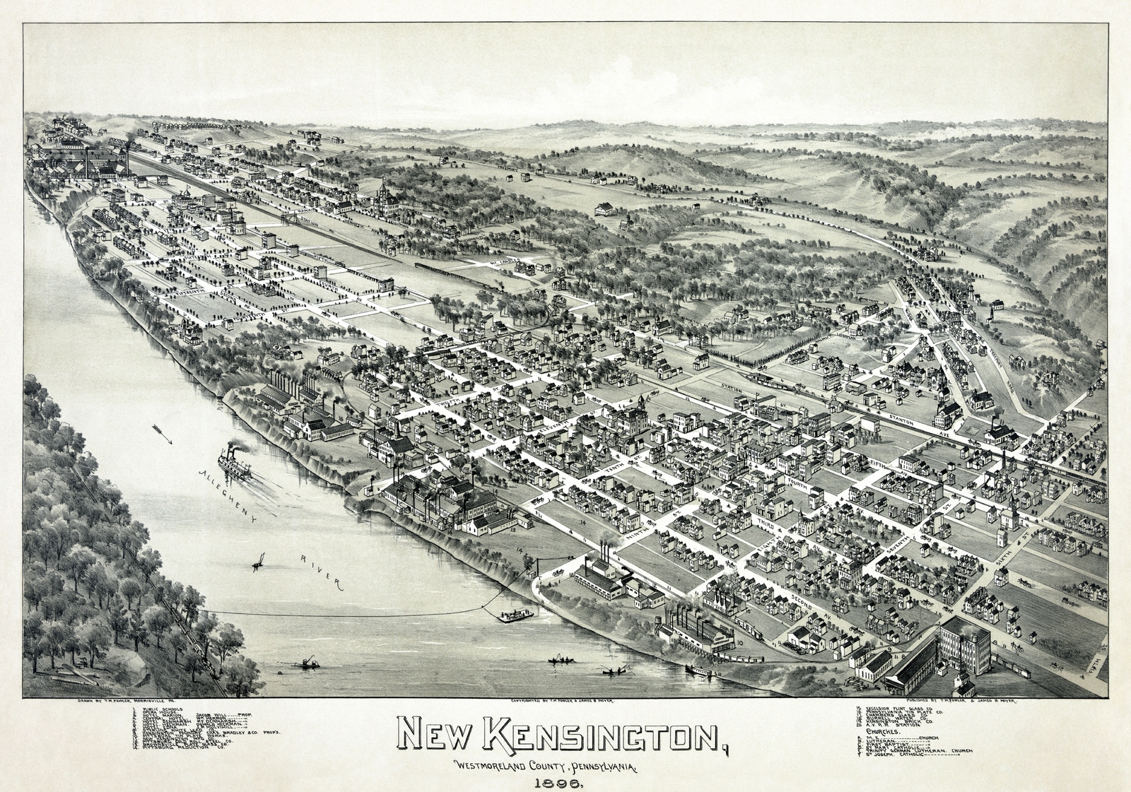 Description: Thaddeus Mortimer Fowler's lithograph showing the town of New Kensington in 1896