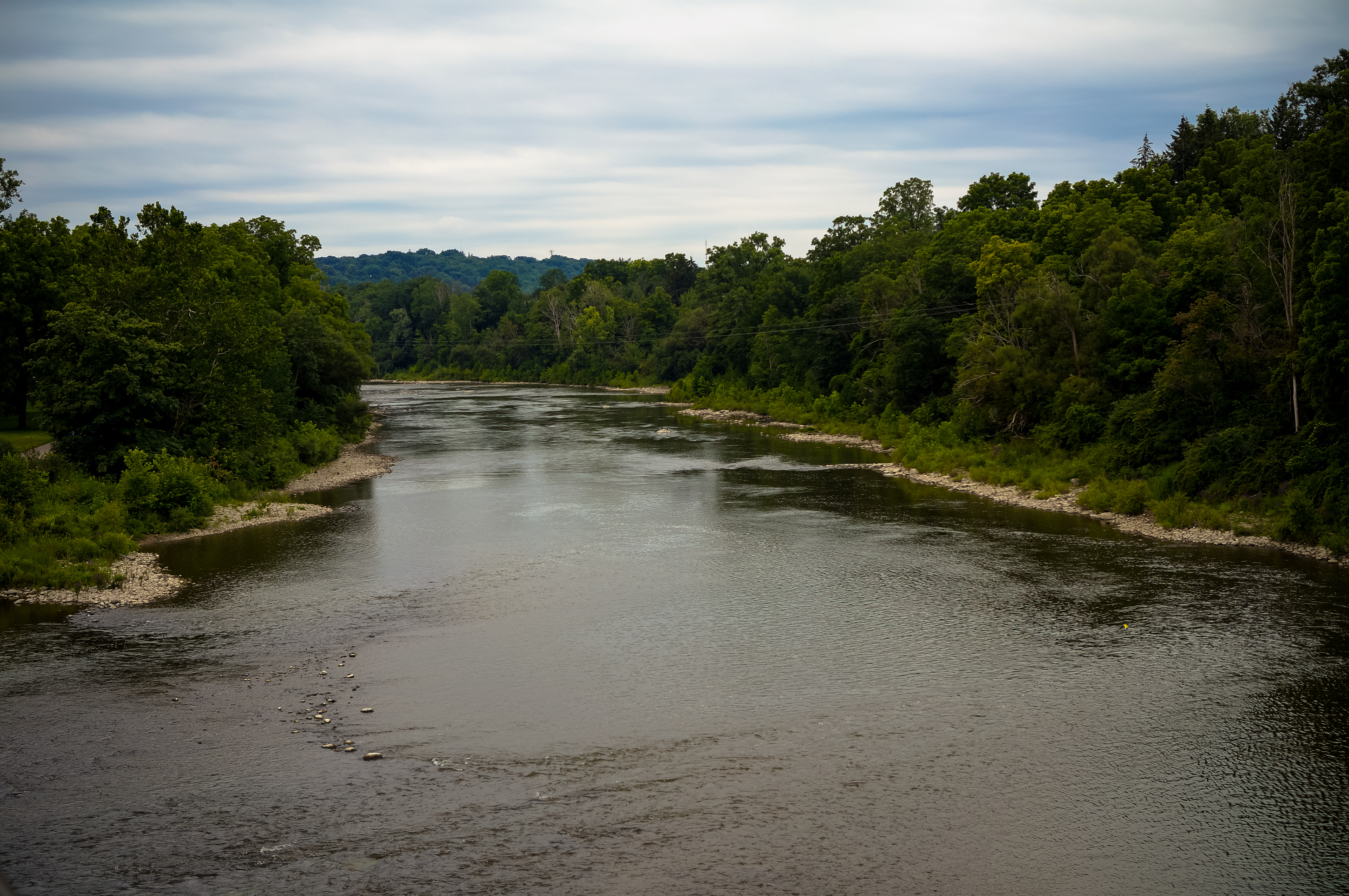 Description: View of the Thames River in London, Ontario, facing South-West off of the bridge on Wonderland Road.
