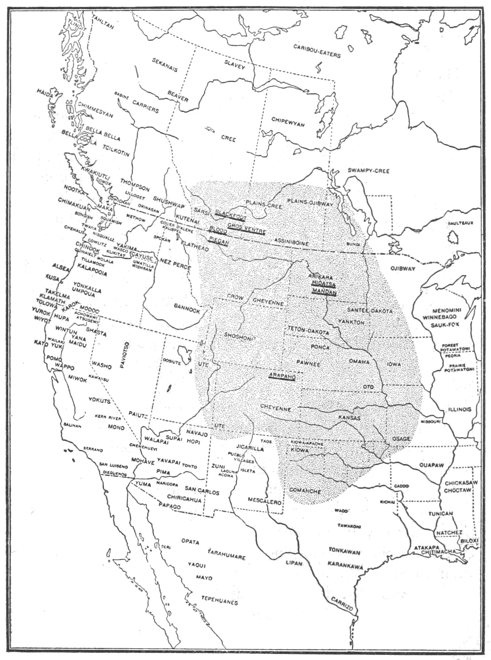 Description: Fig. 102. Distribution of Men's Societies among the Indians of the Plains. The tribes having age-grades are indicated by underlining. (The Blood and Piegan are allied with the Blackfoot.)