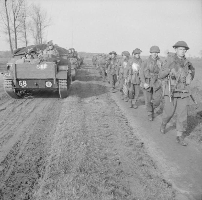 Description: The British Army in North-west Europe 1944-45 Carriers and infantry of the 2nd Gordon Highlanders move up to cross the Elbe, 29 April 1945.