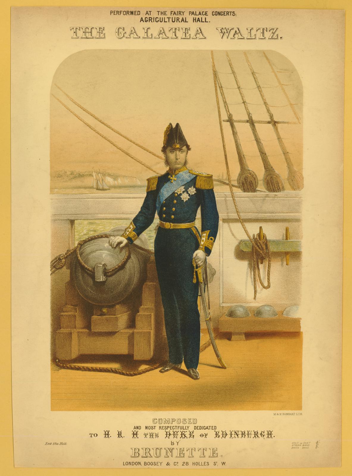Description: Music cover for "TThe Galatea Waltz"; full length portrait of Prince Alfred as a naval officer; on deck of ship, hand resting on canon, other on sword. Chromolithograph