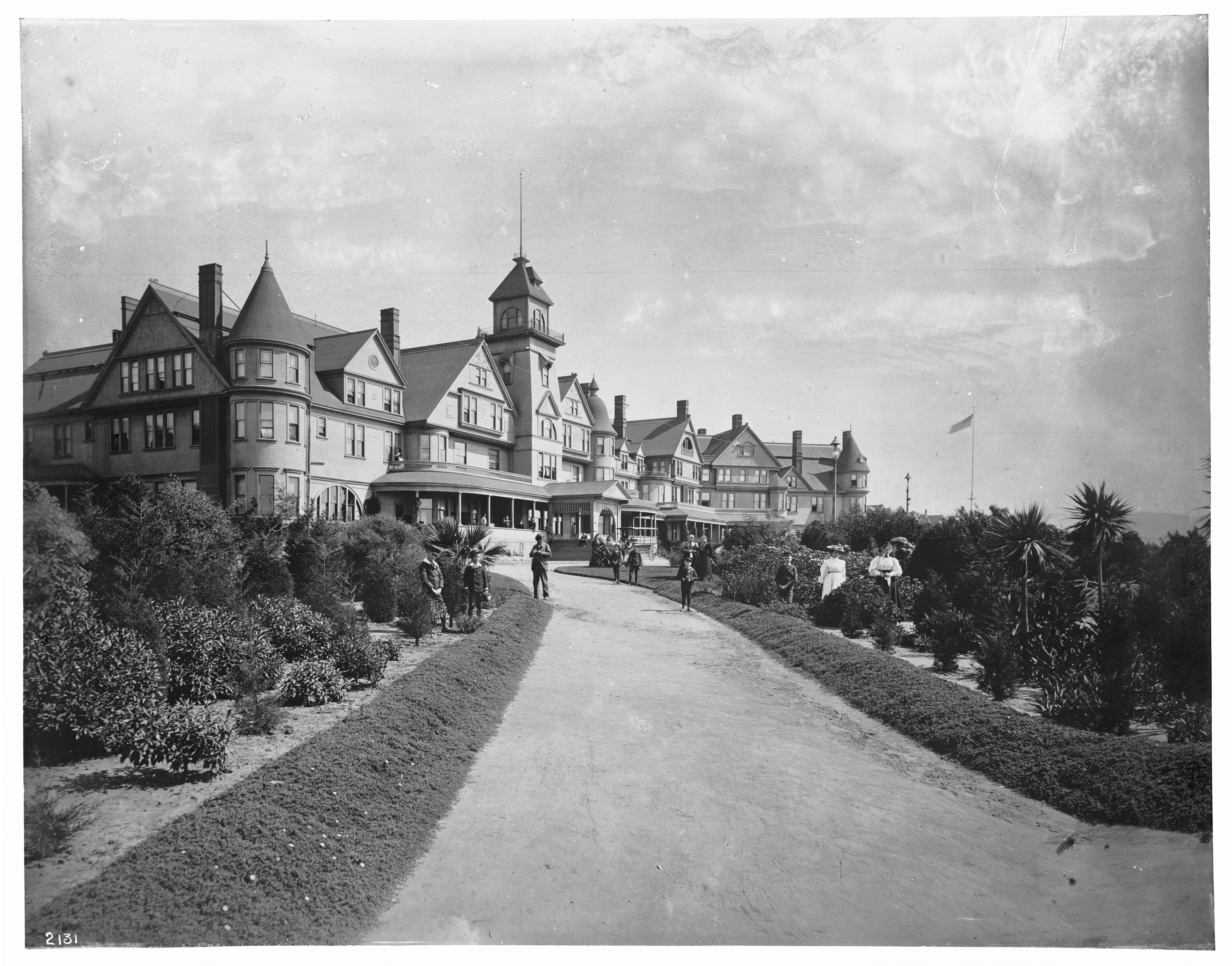 Description: The Hotel Redondo, ca.1900 Photograph of the Redondo Hotel and gardens, ca.1900. Looking southeast up a long walkway to the hotel. Several people are standing in the gardens and on the path. The majestic three-story hotel is Victorian in design. A flag is flying in the distance.; "Hotel Redondo 1890-1925. Messrs. Thompson and Ainsworth from Portland Oregon formed the Redondo Hotel Company. They received a 22 acre tract from the Dominguez Sisters for $5.00. The hotel was opened May1, 1890. There were 225 rooms and a bath on each floor. The Hotel Del Coronado in San Diego is a sister operation built at the same time. The hotel was closed in 1925 and sold for $200.00, for scrap lumber." -- unknown author. Call number: CHS-2131 Filename: CHS-2131 Coverage date: 1895/1905 Part of collection: California Historical Society Collection, 1860-1960 Format: glass plate negatives Type: images Geographic subject (city or populated place): Redondo Beach; Redondo Beach Repository name: USC Libraries Special Collections Accession number: 2131 Microfiche number: 1-42-2 Archival file: chs_Volume25/CHS-2131.tiff Part of subcollection: Title Insurance and Trust, and C.C. Pierce Photography Collection, 1860-1960 Repository address: Doheny Memorial Library, Los Angeles, CA 90089-0189 Geographic subject (country): USA Format (aacr2): 1 photoprint : b&w ; 8 x 10 in.; 1 photograph : glass photonegative, b&w ; 21 x 26 cm. Rights: Digitally reproduced by the USC Digital Library; From the California Historical Society Collection at the University of Southern California Subject (adlf): buildings Project: USC Repository email: specol@usc.edu Contributing entity: California Historical Society Date created: 1895/1905 Publisher (of the digital version): University of Southern California. Libraries Format (aat): photographs Geographic subject (state): California Subject (file heading): Los Angeles County -- Redondo Beach -- Architecture -- General Legacy record ID: chs-m1141; USC-1-1-1-1183 Access conditions: Send requests to address or e-mail given. Phone (213) 821-2366; fax (213) 740-2343. Geographic subject (county): Los Angeles Subject (lcsh): Hotels, taverns, etc.; Resorts Subject: Hotel Redondo