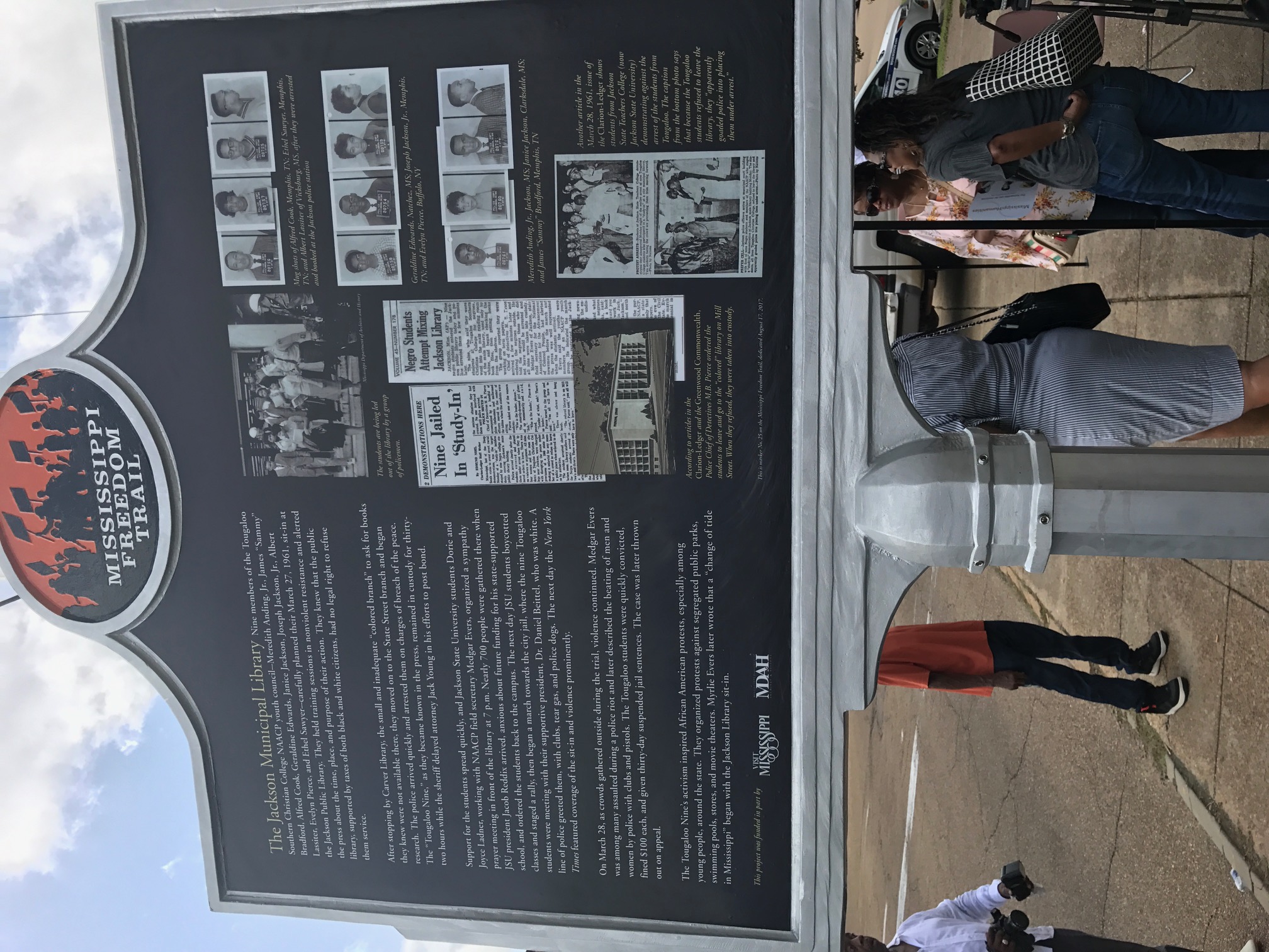 Description: This sign memorializes the Tougaloo Nine, their "Study-In" at the Jackson Municipal Library, and the subsequent protests caused by their arrest.