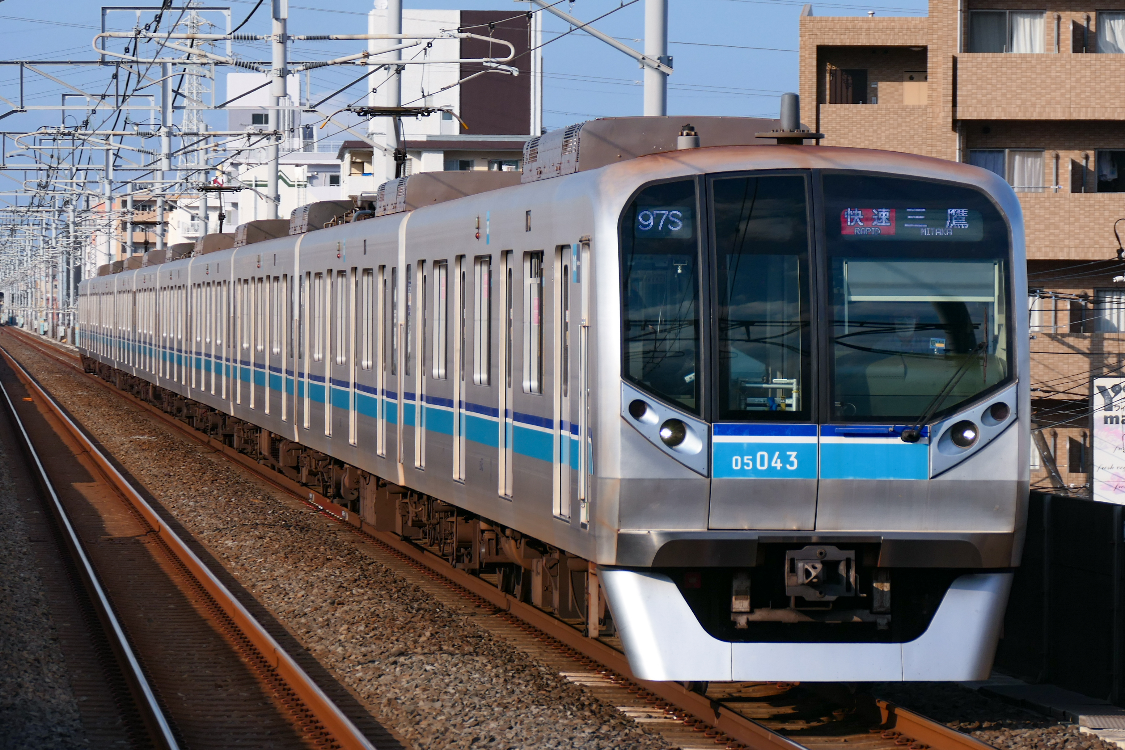 Description: A rapid train bound for Mitaka by 05N series 143 set (13th car) entering Minami Gyotoku Station on the Tokyo Metro Tozai Line.