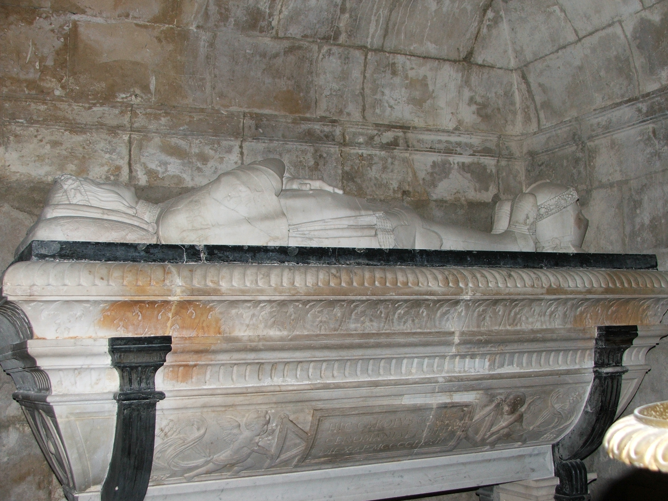 Description: Le bas-relief sur le sarcophage consiste en une tablette ansée (tabula ansata), portée par deux putti, sur laquelle est inscrit en latin : HIC CAROLVS COMES / CENOMANIAE OBIIT DIE X AP MCCCCLXXII : ici Charles comte du Maine s'en est allé, le 10 avril 1472