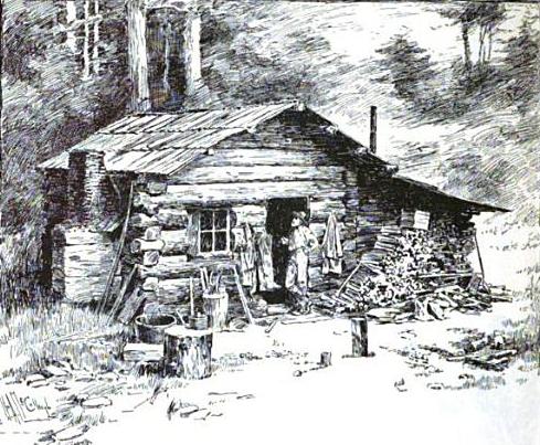 Description: Illustration titled "With the Humboldt Trappers" & labeled "The trapper's cabin" in the article about hunting and trapping in Humboldt County, California. The cabin may have belonged to Seth Kinman, as at least 2 other illustrations in the article are Kinman related.