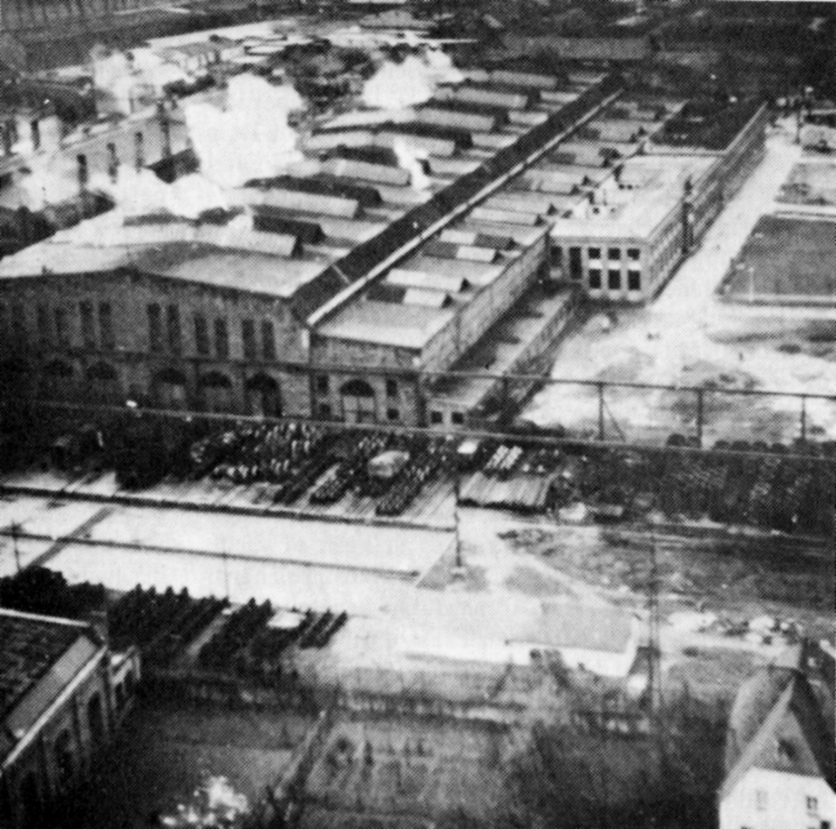 Description: Aerial photograph of an attack by eleven Royal Air Force De Havilland Mosquito B.IV bombers (six from No. 105 Squadron, RAF Marham; five from No. 139 Sqn, RAF Manston) on the railroad network in Trier, Germany, 1 April 1943. This photo shows the attack on the railway yard (Ausbesserungswerk) in Trier-West by 105 Sqn aircraft. As the Mosquitoes attacked from an altitude of 15 m, the 227 kg bombs ricocheted from the steel roof of the locomotive shop and destroyed the adjacent street car depot of the Stadtwerke Trier. Note the Mosquito bomber in the upper center of the photograph.